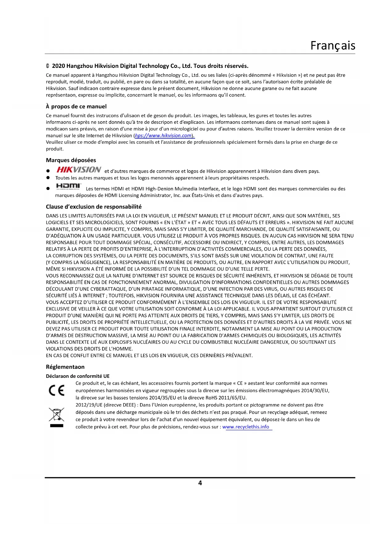 © 2020 Hangzhou Hikvision Digital Technology Co., Ltd. Tous droits réservés. Ce manuel appartient à Hangzhou Hikvision Digital Technology Co., Ltd. ou ses filiales (ci-après dénommé « Hikvision ») et ne peut pas être reproduit, modifié, traduit, ou publié, en partie ou dans sa totalité, en aucune façon que ce soit, sans l’autorisation écrite préalable de Hikvision. Sauf indication contraire expresse dans le présent document, Hikvision ne donne aucune garantie ou ne fait aucune représentation, expresse ou implicite, concernant le manuel, ou les informations qu’il contient. À propos de ce manuel Ce manuel fournit des instructions d’utilisation et de gestion du produit. Les images, les tableaux, les figures et toutes les autres informations ci-après ne sont donnés qu’à titre de description et d’explication. Les informations contenues dans ce manuel sont sujettes à modification sans préavis, en raison d’une mise à jour d’un micrologiciel ou pour d’autres raisons. Veuillez trouver la dernière version de ce manuel sur le site Internet de Hikvision (https://www .hikvision.com). Veuillez utiliser ce mode d’emploi avec les conseils et l’assistance de professionnels spécialement formés dans la prise en charge de ce produit. Marques déposées et d’autres marques de commerce et logos de Hikvision appartiennent à Hikvision dans divers pays. Toutes les autres marques et tous les logos mentionnés appartiennent à leurs propriétaires respectifs. Les termes HDMI et HDMI High-Definition Multimedia Interface, et le logo HDMI sont des marques commerciales ou des marques déposées de HDMI Licensing Administrator, Inc. aux États-Unis et dans d'autres pays. Clause d’exclusion de responsabilité DANS LES LIMITES AUTORISÉES PAR LA LOI EN VIGUEUR, LE PRÉSENT MANUEL ET LE PRODUIT DÉCRIT, AINSI QUE SON MATÉRIEL, SES LOGICIELS ET SES MICROLOGICIELS, SONT FOURNIS « EN L’ÉTAT » ET « AVEC TOUS LES DÉFAUTS ET ERREURS ». HIKVISION NE FAIT AUCUNE GARANTIE, EXPLICITE OU IMPLICITE, Y COMPRIS, MAIS SANS S’Y LIMITER, DE QUALITÉ MARCHANDE, DE QUALITÉ SATISFAISANTE, OU D’ADÉQUATION À UN USAGE PARTICULIER. VOUS UTILISEZ LE PRODUIT À VOS PROPRES RISQUES. EN AUCUN CAS HIKVISION NE SERA TENU RESPONSABLE POUR TOUT DOMMAGE SPÉCIAL, CONSÉCUTIF, ACCESSOIRE OU INDIRECT, Y COMPRIS, ENTRE AUTRES, LES DOMMAGES RELATIFS À LA PERTE DE PROFITS D’ENTREPRISE, À L’INTERRUPTION D’ACTIVITÉS COMMERCIALES, OU LA PERTE DES DONNÉES, LA CORRUPTION DES SYSTÈMES, OU LA PERTE DES DOCUMENTS, S’ILS SONT BASÉS SUR UNE VIOLATION DE CONTRAT, UNE FAUTE (Y COMPRIS LA NÉGLIGENCE), LA RESPONSABILITÉ EN MATIÈRE DE PRODUITS, OU AUTRE, EN RAPPORT AVEC L’UTILISATION DU PRODUIT, MÊME SI HIKVISION A ÉTÉ INFORMÉ DE LA POSSIBILITÉ D’UN TEL DOMMAGE OU D’UNE TELLE PERTE. VOUS RECONNAISSEZ QUE LA NATURE D’INTERNET EST SOURCE DE RISQUES DE SÉCURITÉ INHÉRENTS, ET HIKVISION SE DÉGAGE DE TOUTE RESPONSABILITÉ EN CAS DE FONCTIONNEMENT ANORMAL, DIVULGATION D’INFORMATIONS CONFIDENTIELLES OU AUTRES DOMMAGES DÉCOULANT D’UNE CYBERATTAQUE, D’UN PIRATAGE INFORMATIQUE, D’UNE INFECTION PAR DES VIRUS, OU AUTRES RISQUES DE SÉCURITÉ LIÉS À INTERNET ; TOUTEFOIS, HIKVISION FOURNIRA UNE ASSISTANCE TECHNIQUE DANS LES DÉLAIS, LE CAS ÉCHÉANT. VOUS ACCEPTEZ D’UTILISER CE PRODUIT CONFORMÉMENT À L’ENSEMBLE DES LOIS EN VIGUEUR. IL EST DE VOTRE RESPONSABILITÉ EXCLUSIVE DE VEILLER À CE QUE VOTRE UTILISATION SOIT CONFORME À LA LOI APPLICABLE. IL VOUS APPARTIENT SURTOUT D’UTILISER CE PRODUIT D’UNE MANIÈRE QUI NE PORTE PAS ATTEINTE AUX DROITS DE TIERS, Y COMPRIS, MAIS SANS S’Y LIMITER, LES DROITS DE PUBLICITÉ, LES DROITS DE PROPRIÉTÉ INTELLECTUELLE, OU LA PROTECTION DES DONNÉES ET D’AUTRES DROITS À LA VIE PRIVÉE. VOUS NE DEVEZ PAS UTILISER CE PRODUIT POUR TOUTE UTILISATION FINALE INTERDITE, NOTAMMENT LA MISE AU POINT OU LA PRODUCTION D’ARMES DE DESTRUCTION MASSIVE, LA MISE AU POINT OU LA FABRICATION D’ARMES CHIMIQUES OU BIOLOGIQUES, LES ACTIVITÉS DANS LE CONTEXTE LIÉ AUX EXPLOSIFS NUCLÉAIRES OU AU CYCLE DU COMBUSTIBLE NUCLÉAIRE DANGEREUX, OU SOUTENANT LES VIOLATIONS DES DROITS DE L’HOMME. EN CAS DE CONFLIT ENTRE CE MANUEL ET LES LOIS EN VIGUEUR, CES DERNIÈRES PRÉVALENT. Réglementation Déclaration de conformité UE