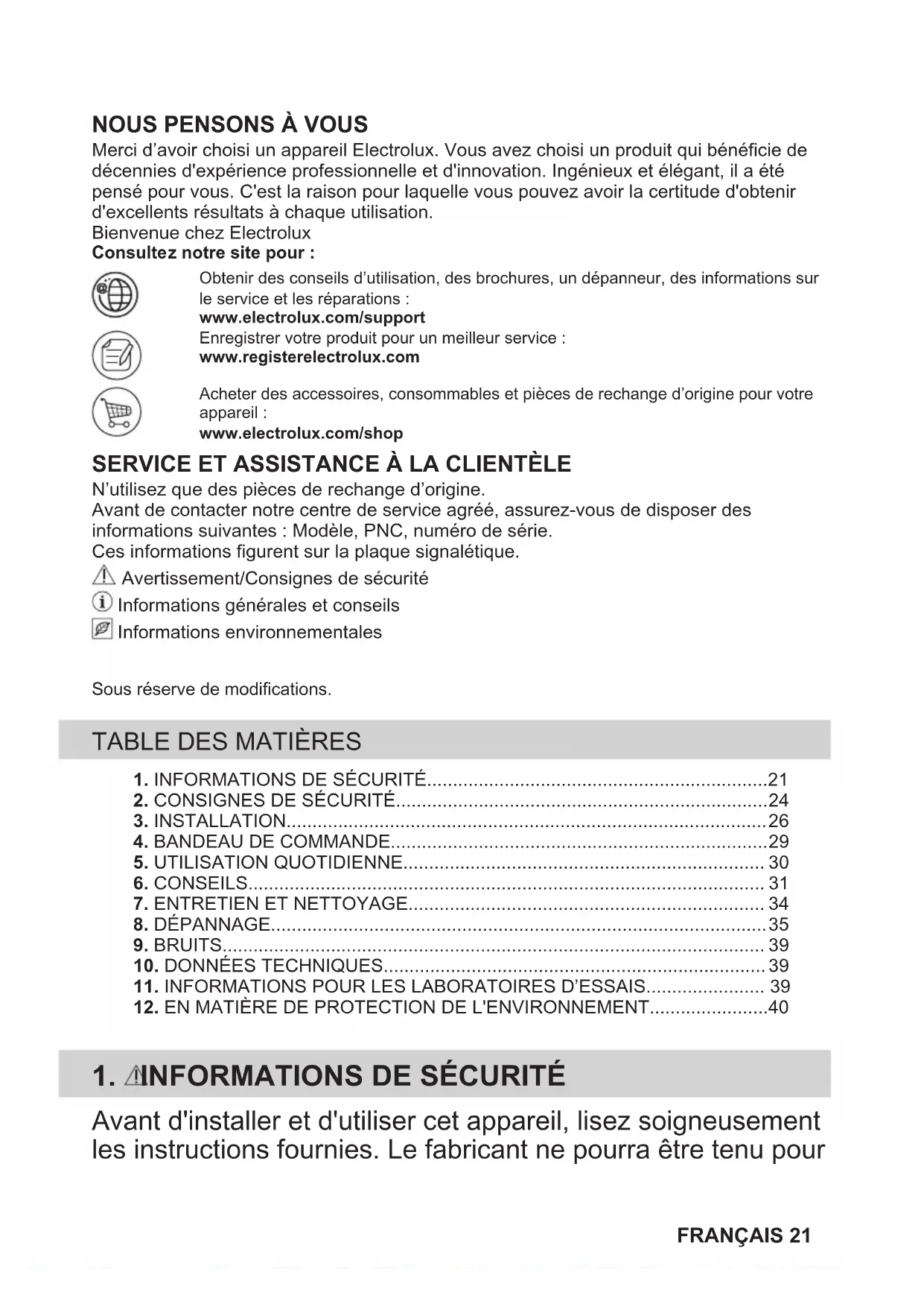 Merci d’avoir choisi un appareil Electrolux. Vous avez choisi un produit qui bénéficie dedécennies d'expérience professionnelle et d'innovation. Ingénieux et élégant, il a étépensé pour vous. C'est la raison pour laquelle vous pouvez avoir la certitude d'obtenird'excellents résultats à chaque utilisation.Bienvenue chez ElectroluxConsultez notre site pour :Obtenir des conseils d’utilisation, des brochures, un dépanneur, des informations surle service et les réparations :www.electrolux.com/supportEnregistrer votre produit pour un meilleur service :www.registerelectrolux.comAcheter des accessoires, consommables et pièces de rechange d’origine pour votreappareil :www.electrolux.com/shop
