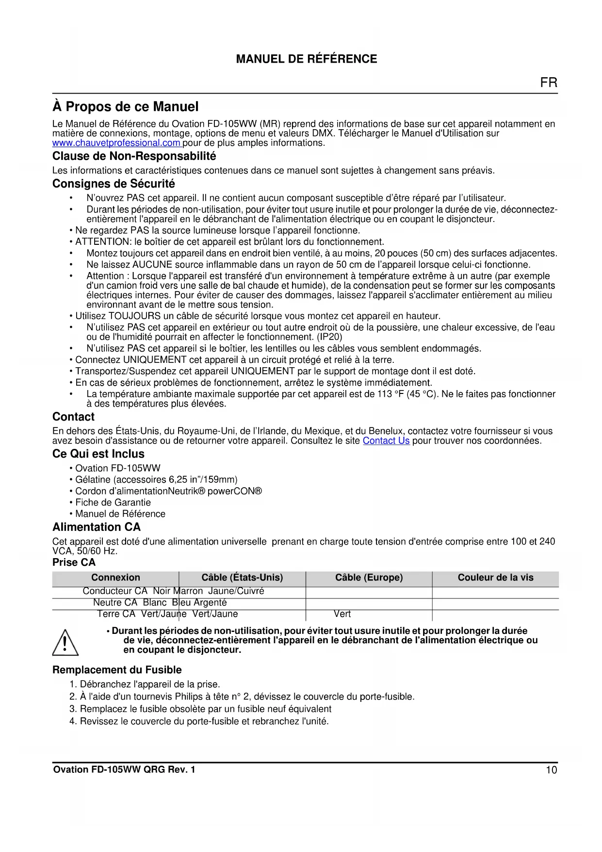 À Propos de ce Manuel Le Manuel de Référence du Ovation FD-105WW (MR) reprend des informations de base sur cet appareil notamment en matière de connexions, montage, options de menu et valeurs DMX. Télécharger le Manuel d'Utilisation sur www.chauvetprofessional.com pour de plus amples informations. Clause de Non-Responsabilité Les informations et caractéristiques contenues dans ce manuel sont sujettes à changement sans préavis. Consignes de Sécurité