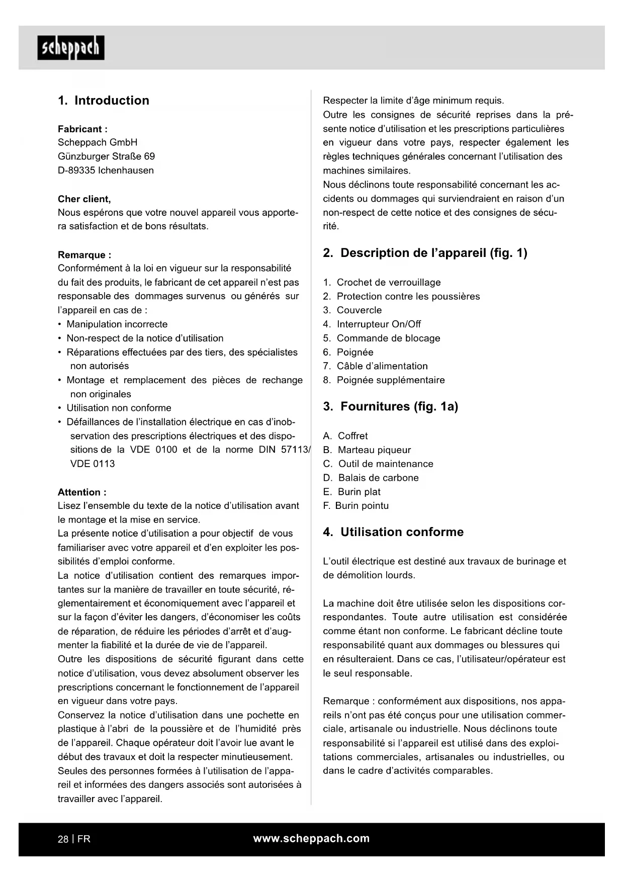 Fabricant : Scheppach GmbH Günzburger Straße 69 D-89335 Ichenhausen Cher client, Nous espérons que votre nouvel appareil vous apporte- ra satisfaction et de bons résultats. Remarque : Conformément à la loi en vigueur sur la responsabilité du fait des produits, le fabricant de cet appareil n’est pas responsable des dommages survenus ou générés sur l’appareil en cas de :