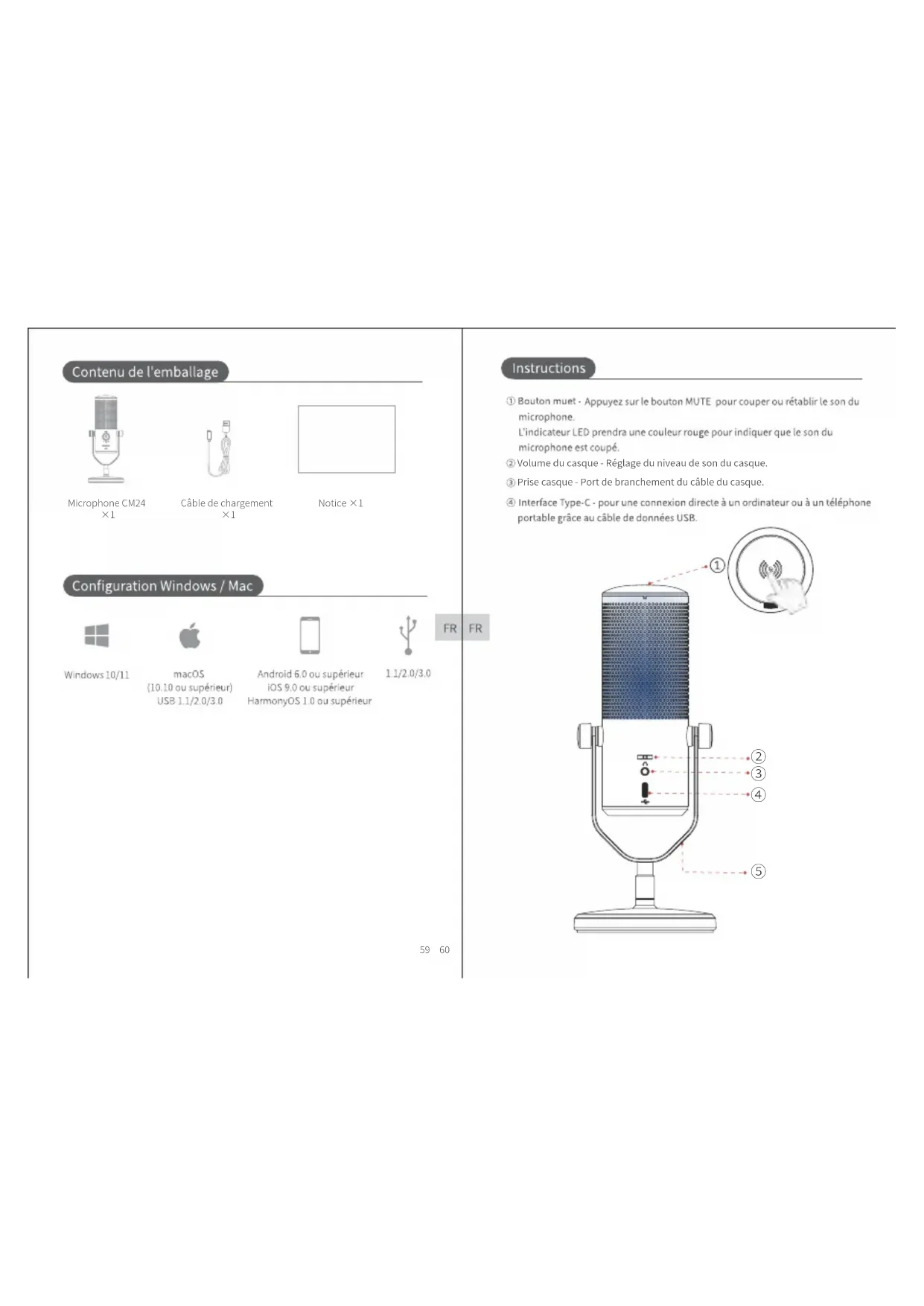 ① Bouton muet - Appuyez sur le bouton MUTE pour couper ou rétablier le son du microphone. L'indicateur LED prendra une couleur rouge pour indiquer que le son du microphone est coupé.