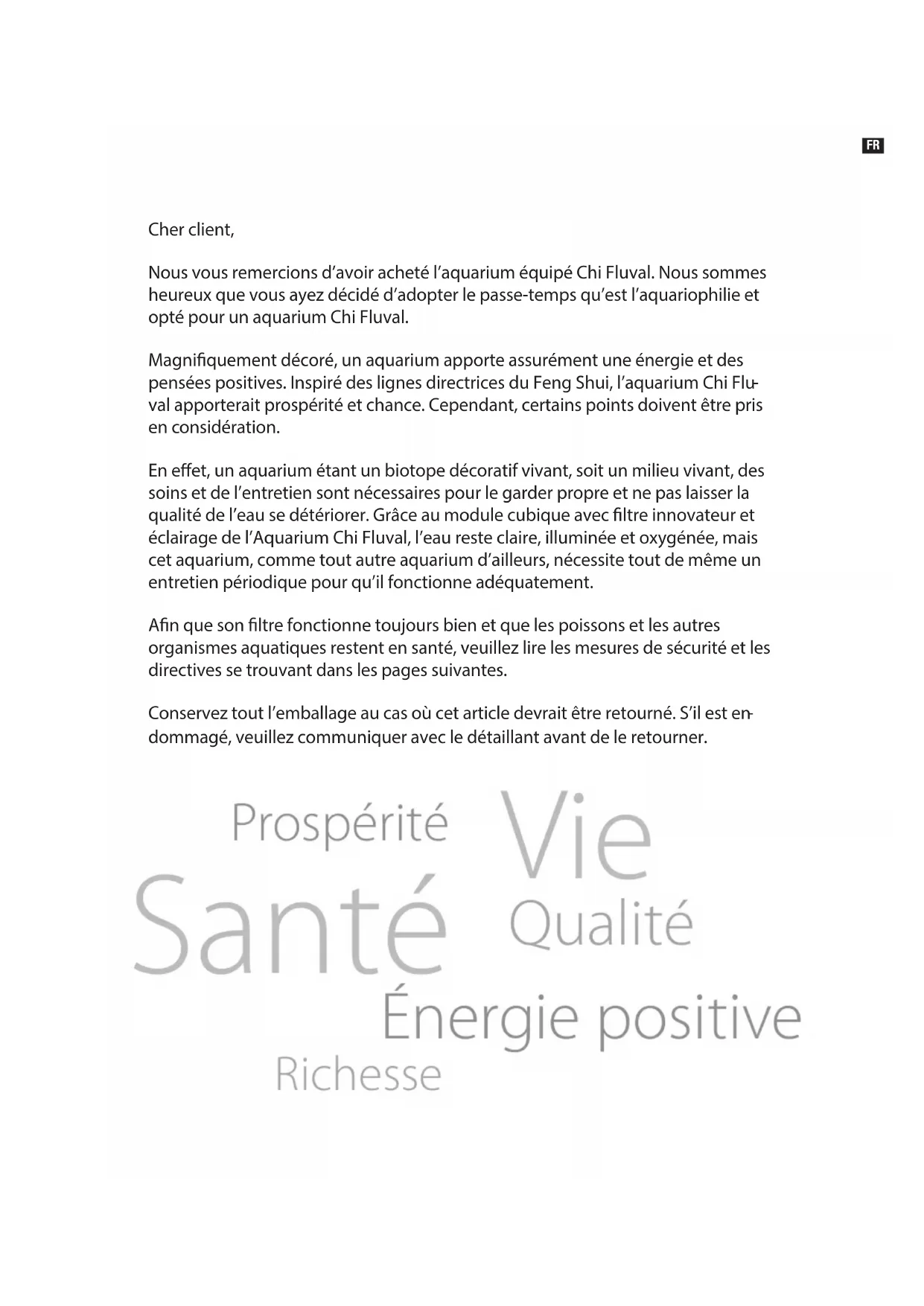 For Authorized Warranty Service please return (well packaged and by registered post) to the address below enclosing dated receipt and reason for return. If you have any queries or comments about the operation of this product, please let us try to help you before you return the product to your retailer. Most queries can be handled promptly with a phone call. When you call (or write), please have all relevant information such as model number, age of product, details of aquarium set-up, as well as the nature of the problem. CANADA: Consumer Repair, Rolf C. Hagen Inc., 20500 Trans Canada Hwy, Baie d’Urfé, QC H9X 0A2 Canada only: 1-800-554-2436 between 9:00 a.m. and 4:30 p.m. Eastern Standard Time. Ask for Customer Service. U.S.A.: Rolf C. Hagen (U.S.A.) Corp., 305 Forbes Blvd, Mansfield, MA. 02048 U.S.A only: 1-800-724-2436 between 9:00 a.m. and 4:00 p.m. Eastern Standard Time. Ask for Customer Service. UK: Rolf C. Hagen (UK) Ltd, Customer Service Department, California Drive, Whitwood Ind Est., Castleford, West Yorkshire WF10 5QH U.K. only: Helpline Number 01977 556622. Between 9:00 AM and 5:00 PM, Monday to Thursday, 4:00 PM friday (excluding Bank Holidays). www.hagen-uk.custhelp.comFR Cher client,Nous vous remercions d’avoir acheté l’aquarium équipé Chi Fluval. Nous sommes heureux que vous ayez décidé d’adopter le passe-temps qu’est l’aquariophilie et opté pour un aquarium Chi Fluval.Magniquement décoré, un aquarium apporte assurément une énergie et des pensées positives. Inspiré des lignes directrices du Feng Shui, l’aquarium Chi Flu val apporterait prospérité et chance. Cependant, certains points doivent être pris en c onsidération. En eet, un aquarium étant un biotope décoratif vivant, soit un milieu vivant, des soins et de l’entretien sont nécessaires pour le garder propre et ne pas laisser la qualité de l’eau se détériorer. Grâce au module cubique avec ltre innovateur et éclairage de l’Aquarium Chi Fluval, l’eau reste claire, illuminée et oxygénée, mais cet aquarium, comme tout autre aquarium d’ailleurs, nécessite tout de même un entretien périodique pour qu’il fonctionne adéquatement.An que son ltre fonctionne toujours bien et que les poissons et les autres organismes aquatiques restent en santé, veuillez lire les mesures de sécurité et les directives se trouvant dans les pages suivantes.Conservez tout l’emballage au cas où cet article devrait être retourné. S’il est en dommagé, veuillez communiquer avec le détaillant avant de le retourner. Qualité Santé Richesse Prospérité Vie Énergie positiveFR