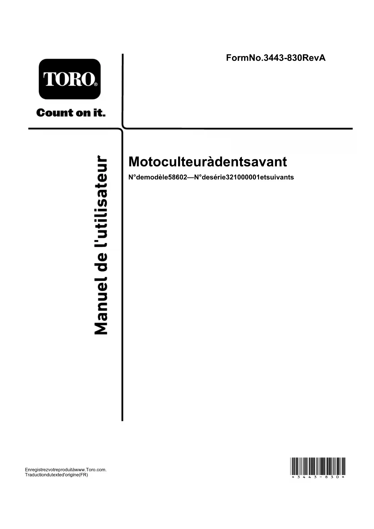 - AlgunasempresaspuedenoptarpornoproporcionaradvertenciasporqueconcluyenquenoestánobligadasahacerlobajolaProposición65;la faltadeadvertenciasenunproductonosignicaqueelproductoestélibredelosproductosquímicosincluidosenlalistaanivelessimilares. ¿PorquéincluyeToroestaadvertencia? Torohaoptadoporproporcionaralosconsumidoreslamayorcantidadposibledeinformaciónparaquepuedatomardecisionesinformadassobrelos productosquecomprayutiliza.Toroproporcionaadvertenciasenciertoscasosbasándoseensusconocimientossobrelapresenciadeunoomás productosquímicosdelalista,sinevaluarelniveldeexposición,puestoquelalistanoincluyelímitesdeexposiciónparatodoslosproductosquímicos quecontiene.AunquelaexposiciónqueprovocanlosproductosT oropuedeserinsignicante,oestardentrodeloslímitesdelacategoría“sinriesgo signicativo”,TorohaoptadoporproporcionarlasadvertenciasdelaProposición65porsimpleprecaución.Además,siToronoproporcionaraestas advertencias,podríaserdemandadaporelEstadodeCaliforniaoporparticularesbajolaProposición65,yestarsujetaaimportantessanciones. RevAFormNo.3443-830RevA Motoculteuràdentsavant N°demodèle58602—N°desérie321000001etsuivants Enregistrezvotreproduitàwww.Toro.com.Traductiondutexted'origine(FR) *3443-830*Vouscommettezuneinfractionàlasection4442 ou4443duCodedesressourcespubliquesde Californiesivousutilisezcettemachinedansune zoneboisée,broussailleuseourecouverted'herbe,à moinsd'équiperlemoteurd'unpare-étincellesenbon état,telquedénidanslasection4442,ouàmoins quelemoteursoitconstruit,équipéetentretenu correctementpourprévenirlesincendies. ATTENTION CALIFORNIE Proposition65-Avertissement Lesgazd'échappementdeceproduit contiennentdessubstanceschimiques considéréesparl'étatdeCaliforniecomme susceptiblesdeprovoquerdescancers, desmalformationscongénitalesetautres troublesdelareproduction. L'utilisationdeceproduitpeutentraîner uneexpositionàdessubstances chimiquesconsidéréespasl'étatde Californiecommecapablesdeprovoquer descancers,desanomaliescongénitales oud'autrestroublesdelareproduction. Introduction Cemotoculteurestdestinéaugrandpublic,ouàdes utilisateursprofessionnelstemporairespourtravailler lessolsdursenvuedeplanteretcultiverdesjardins. L'utilisationdeceproduitàd'autresnsquecelle prévuepeutêtredangereusepourvous-mêmeet toutepersonneàproximité. Lisezattentivementcettenoticepourapprendre commentutiliseretentretenircorrectementvotre produit,etéviterainsidel'endommageroudevous blesser.Vousêtesresponsabledel'utilisationsûreet correcteduproduit. Pourplusd’information,ycomprisdesconseils desécurité,desdocumentsdeformation,des renseignementsconcernantunaccessoire,pour obtenirl'adressed'undépositaireoupourenregistrer votreproduit,rendez-voussurlesitewww.Toro.com. Pourobtenirdesprestationsdeservice,des piècesTorod'origineoudesrenseignements complémentaires,munissez-vousdesnuméros demodèleetdesérieduproduitetcontactezun dépositaire-réparateurouleserviceclientToroagréé. LaFigure1indiquel'emplacementdesnumérosde modèleetdesérieduproduit.Inscrivezlesnuméros dansl'espaceréservéàceteffet. g355851 Figure1 1.EmplacementdesnumérosdemodèleetdesérieN°demodèleN°desérie Lesmisesengardedecemanuelsoulignentdes dangerspotentielsetsontsignaléesparlesymbole desécurité(Figure2),quiindiqueundangerpouvant entraînerdesblessuresgravesoumortellessiles précautionsrecommandéesnesontpasrespectées. g000502 Figure2 Symboledesécurité Cemanuelutilisedeuxtermespourfairepasserdes renseignementsessentiels.Important,pourattirer l'attentionsuruneinformationd'ordremécanique spécique,etRemarque,poursoulignerune informationd'ordregénéralméritantuneattention particulière. ©2021—TheToro®Company8111LyndaleAvenueSouthBloomington,MN55420 Contactez-noussurwww.Toro.com.ImpriméauxÉtats-UnisTousdroitsréservésTabledesmatières Sécurité....................................................................3 Consignesdesécuritégénérales........................3 Autocollantsdesécuritéetd'instruction..............4 Miseenservice.........................................................6 1Assemblagedumotoculteur............................6 2Ajoutd'huiledanslemoteur.............................8 Vued'ensembleduproduit......................................10 Commandes....................................................10 Caractéristiquestechniques............................10 Avantl'utilisation...................................................11 Consignesdesécuritéavantl'utilisation.............11 Procéduresd'entretienquotidien......................12 Changerlalargeurdetravail.............................12 Pendantl'utilisation.............................................12 Consignesdesécuritépendant l'utilisation.....................................................12 Démarragedumoteur.......................................13 Arrêtdumoteur.................................................13 Réglagedelapositiondusupport arrière...........................................................13 Réglagedelabarredetraînée..........................14 Travaillerlesol..................................................15 Aprèsl'utilisation.................................................15 Consignesdesécuritéaprèsl'utilisation............15 Entretien.................................................................16 Consignesdesécuritépendant l'entretien......................................................16 Programmed'entretienrecommandé..................16 Procéduresavantl'entretien................................17 Préparationàl'entretien....................................17 Entretiendumoteur.............................................17 Entretiendultreàair.......................................17 Vidangedel'huilemoteur..................................18 Entretiendelabougie.......................................19 Entretiendescourroies........................................20 Contrôleetréglagedelatensiondela courroie..................
