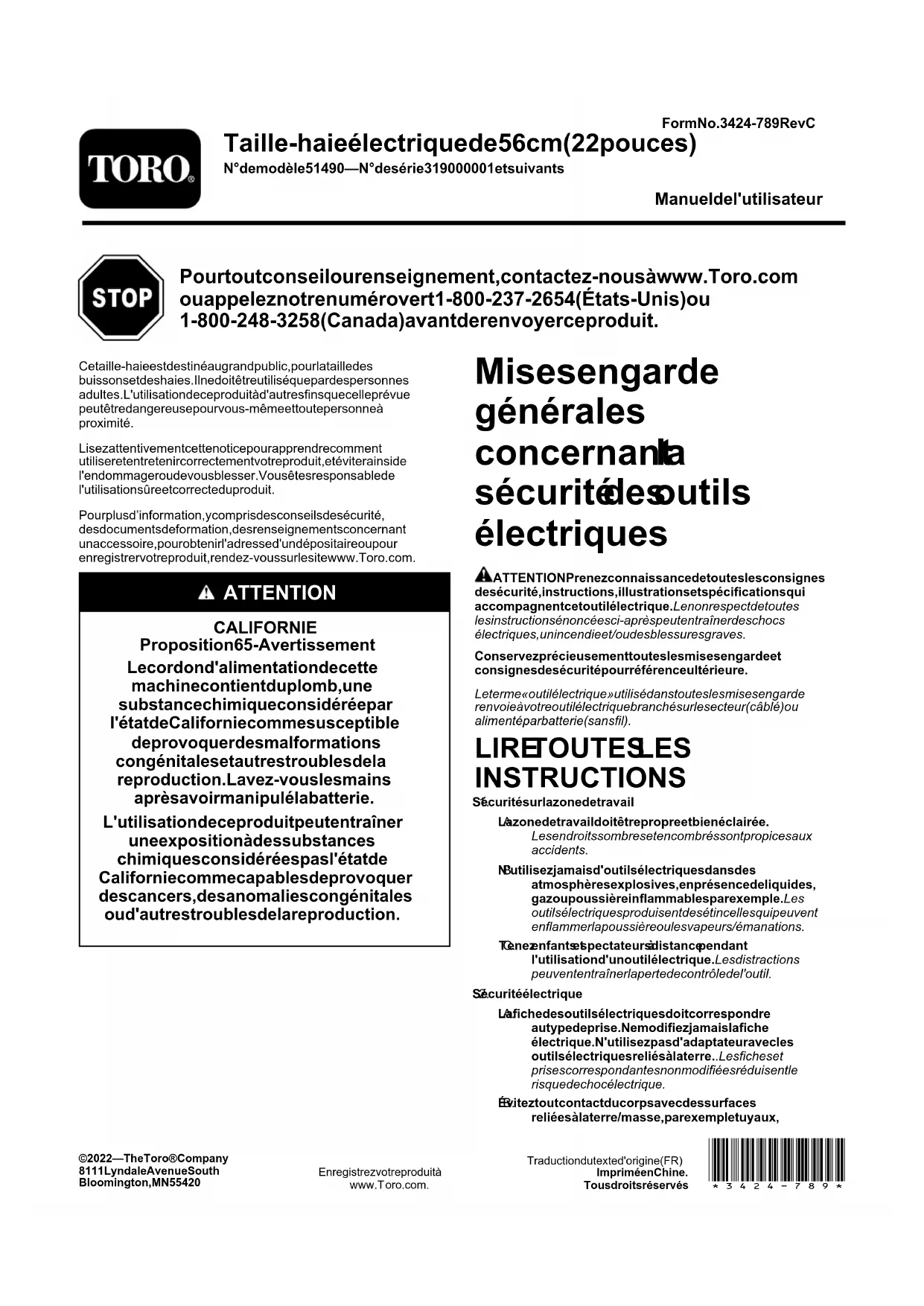 - AlgunasempresaspuedenoptarpornoproporcionaradvertenciasporqueconcluyenquenoestánobligadasahacerlobajolaProposición65;la faltadeadvertenciasenunproductonosignicaqueelproductoestélibredelosproductosquímicosincluidosenlalistaanivelessimilares. ¿Porquéincluyeelfabricanteestaadvertencia? Elfabricantehaoptadoporproporcionaralosconsumidoreslamayorcantidadposibledeinformaciónparaquepuedantomardecisionesinformadas sobrelosproductosquecomprayutiliza.Elfabricanteproporcionaadvertenciasenciertoscasosbasándoseensusconocimientossobrelapresenciade unoomásproductosquímicosdelalista,sinevaluarelniveldeexposición,puestoquelalistanoincluyelímitesdeexposiciónparatodoslosproductos químicosquecontiene.Aunquelaexposiciónqueprovocanlosproductosdelfabricantepuedeserinsignicante,oestardentrodeloslímitesdela categoría“sinriesgosignicativo”,elfabricantehaoptadoporproporcionarlasadvertenciasdelaProposición65porsimpleprecaución.Además,si elfabricantenoproporcionaraestasadvertencias,podríaserdemandadaporelEstadodeCaliforniaoporparticularesbajolaProposición65, yestarsujetaaimportantessanciones. RevAFormNo.3424-789RevC Taille-haieélectriquede56cm(22pouces) N°demodèle51490—N°desérie319000001etsuivants Manueldel'utilisateur Pourtoutconseilourenseignement,contactez-nousàwww.Toro.com ouappeleznotrenumérovert1-800-237-2654(États-Unis)ou 1-800-248-3258(Canada)avantderenvoyerceproduit. Cetaille-haieestdestinéaugrandpublic,pourlatailledesbuissonsetdeshaies.Ilnedoitêtreutiliséquepardespersonnesadultes.L'utilisationdeceproduitàd'autresnsquecelleprévuepeutêtredangereusepourvous-mêmeettoutepersonneàproximité.Lisezattentivementcettenoticepourapprendrecommentutiliseretentretenircorrectementvotreproduit,etéviterainsidel'endommageroudevousblesser.Vousêtesresponsabledel'utilisationsûreetcorrecteduproduit.Pourplusd’information,ycomprisdesconseilsdesécurité,desdocumentsdeformation,desrenseignementsconcernantunaccessoire,pourobtenirl'adressed'undépositaireoupourenregistrervotreproduit,rendez-voussurlesitewww.Toro.com. ATTENTION CALIFORNIE Proposition65-Avertissement Lecordond'alimentationdecette machinecontientduplomb,une substancechimiqueconsidéréepar l'étatdeCaliforniecommesusceptible deprovoquerdesmalformations congénitalesetautrestroublesdela reproduction.Lavez-vouslesmains aprèsavoirmanipulélabatterie. L'utilisationdeceproduitpeutentraîner uneexpositionàdessubstances chimiquesconsidéréespasl'étatde Californiecommecapablesdeprovoquer descancers,desanomaliescongénitales oud'autrestroublesdelareproduction. Misesengarde générales concernantla sécuritédesoutils électriques ATTENTIONPrenezconnaissancedetouteslesconsignesdesécurité,instructions,illustrationsetspécicationsquiaccompagnentcetoutilélectrique.Lenonrespectdetouteslesinstructionsénoncéesci-aprèspeutentraînerdeschocsélectriques,unincendieet/oudesblessuresgraves.Conservezprécieusementtouteslesmisesengardeetconsignesdesécuritépourréférenceultérieure.Leterme«outilélectrique»utilisédanstouteslesmisesengarderenvoieàvotreoutilélectriquebranchésurlesecteur(câblé)oualimentéparbatterie(sansl). LIRETOUTESLES INSTRUCTIONS 1.SécuritésurlazonedetravailA.Lazonedetravaildoitêtrepropreetbienéclairée.Lesendroitssombresetencombréssontpropicesauxaccidents.B.N'utilisezjamaisd'outilsélectriquesdansdesatmosphèresexplosives,enprésencedeliquides,gazoupoussièreinammablesparexemple.Lesoutilsélectriquesproduisentdesétincellesquipeuventenammerlapoussièreoulesvapeurs/émanations. C.Tenezenfantsetspectateursàdistancependant l'utilisationd'unoutilélectrique.Lesdistractionspeuvententraînerlapertedecontrôledel'outil.2.SécuritéélectriqueA.Lachedesoutilsélectriquesdoitcorrespondreautypedeprise.Nemodiezjamaislacheélectrique.N'utilisezpasd'adaptateuraveclesoutilsélectriquesreliésàlaterre..Leschesetprisescorrespondantesnonmodiéesréduisentlerisquedechocélectrique.B.Éviteztoutcontactducorpsavecdessurfacesreliéesàlaterre/masse,parexempletuyaux,©2022—TheToro®Company8111LyndaleAvenueSouthBloomington,MN55420Enregistrezvotreproduitàwww.Toro.com.Traductiondutexted'origine(FR)ImpriméenChine.Tousdroitsréservés*3424-789*radiateurs,cuisinièresetréfrigérateurs.Lerisquede chocélectriqueaugmentesivousêtesreliéàlaterre. C.N'exposezpaslesoutilsélectriquesàlapluieou àl'humidité.Touteinltrationd'eaudansunoutil électriqueaugmentelerisquedechocélectrique. D.Nemaltraitezpaslecordond'alimentation.Nevous servezjamaisducordonpourtransporter,tirerou débrancherl'outilélectrique.Éloignezlecordondes surfaceschaudes,delagraisse,desarêtesvives oudespiècesmobiles.Lescordonsendommagésou emmêlésaugmententlerisquedechocélectrique. E.Sivousutilisezunoutilélectriqueàl'extérieur, utiliseztoujoursunerallongeadaptéeàl'usage extérieur.L'utilisationd'unerallongeprévuepour l'usageextérieurréduitlerisquedechocélectrique. F.Sil'utilisationd'unoutilélectriquedansunendroit humidenepeutêtreévitée,utilisezunealimentation protégéeparundisjoncteurdefuiteàlaterre (GFCI).L'utilisationd'undisjoncteurGFCIréduitle risquedechocélectrique. G.Débranchezlachedelasourced'alimentation lorsquel'outilnesertpas.Cesmesuresdesécurité préventivesréduisentlerisquededémarrageaccidentel del'outil. 3.Sécuritépersonnelle A.Restezvigilant(e),concentrez-voussurvotre tâcheetfaitespreuvedebonsenslorsquevous utilisezunoutilélectrique.N'utilisezjamaisunoutil électriquesivousêtesfatiguéousousl'emprisede l'alcool,dedroguesoudemédicaments.Unseul momentd'inattentionpendantl'utilisationpeutentraîner degravesblessures. B.Utilisezdeséquipementsdeprotectionindividuelle. Porteztoujoursuneprotectionoculaire.Les équipementsdeprotectionindividuellecommeles masquesantipoussière,leschaussuresdesécuritéà semelleantidérapante,lescasquesetlesprotections antibruitutilisésdemanièrepertinenteréduisentles risquesdeblessures. C.Éviteztoutdémarrageaccidentel.Assurez-vous quel'interrupteurMarche/Arrêtestenposition ARRÊ