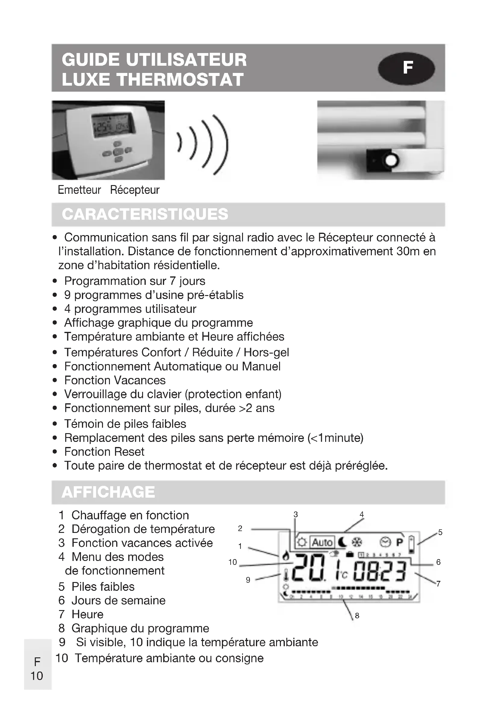 9GUIDE UTILISATEUR LUXE THERMOSTAT Emetteur Récepteur CARACTERISTIQUES