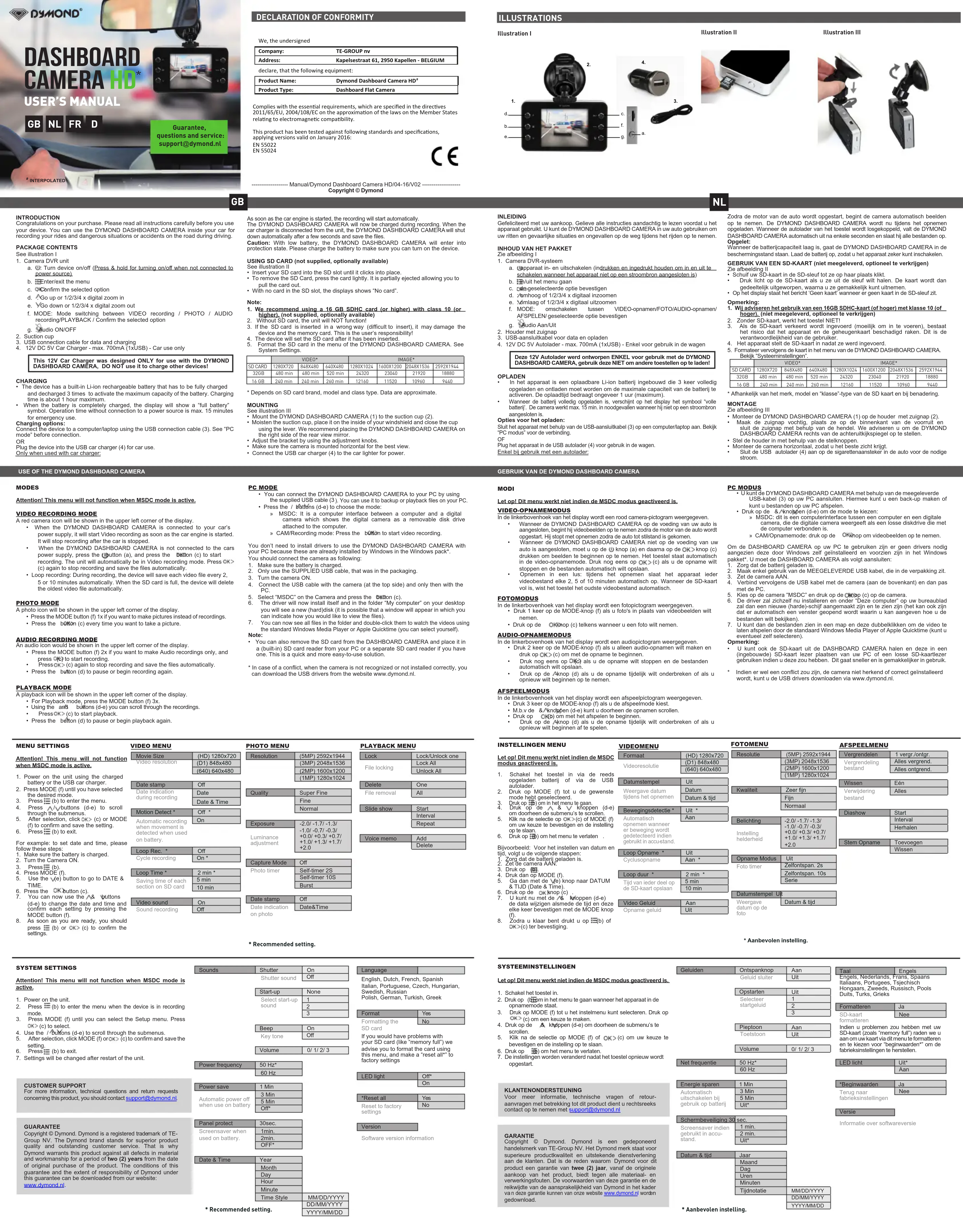 4.FR INTRODUCTIONNous vous félicitons pour votre achat. Veuillez lire attentivement toutes les instructions avant d’utiliser votre appareil. Vous pouvez utiliser le DYMOND DASHBOARD CAMERA à l’intérieur de votre voiture an d’enregistrer vos promenades et les accidents et situations dangereuses dont vous êtes témoin sur la route.CONTENU DE LA BOÎTE Référez-vous à l’illustration I1. Caméra DVRa. : allumer/éteindre l’appareil (Pour allumer/éteindre l’appareil lorsqu’il n’est pas branché à une source d’alimentation, le bouton POWER doit être maintenu enfoncé.) b. : accéder/sortir du menuc. : conrmer la sélectiond. : se déplacer vers le haut ou effectuer un zoom numérique avant 1/2/3/4Xe. : se déplacer vers le bas ou effectuer un zoom numérique arrière 1/2/3/4Xf. MODE : passer d’un mode à l’autre (enregistrement VIDÉO/PHOTO/enregistrement AUDIO/LECTURE) / conrmer la sélectiong. : Audio allumé/éteint2. Support à ventouse3. Câble USB pour le transfert de données et la charge4. Chargeur de voiture 12V DC 5V - max. 700mA (1xUSB) - à utiliser seulement dans la voitureCe chargeur de voiture 12V a été conçu pour être utilisé avec le DYMOND DASHBOARD CAMERA, NE PAS utiliser pour charger d'autres appareils! CHARGEMENT• L’appareil intègre une batterie Li-ion rechargeable. Pour bénécier de la capacité maximale de cette batterie, elle doit être chargée et déchargée complètement trois fois. La durée de chargement est d'approximativement 1 heure maximum. • Lorsque la batterie est complètement chargée, l’écran afche une icône représentant une batterie chargée. La durée de fonctionnement autonome (sans branchement à une source d’alimentation) est de 15 minutes maximum en cas d’urgence.Options de chargement :Brancher l’appareil à un ordinateur à l’aide du câble USB (3). Voir “Mode PC” avant la connexion. Brancher l’appareil à une prise allume-cigares à l’aide du chargeur de voiture USB (4) pour une utilisation dans la voiture.Seulement lors l’utilisation d’un chargeur de voiture:Au démarrage du moteur du véhicule, l’enregistrement débute automatiquement.Le chargement du DYMOND DASHBOARD CAMERA se poursuit pendant l’enregis-trement. Lorsque le chargeur de voiture n’est pas branché à la caméra, celle-ci s’éteint automatiquement après quelques secondes après avoir enregistré les chiers.Avertissement : Lorsque le niveau de batterie est faible, le DYMOND DASHBOARD CAMERA entre en mode protection. Veuillez charger la batterie an de pouvoir allumer l’appareil.UTILISATION D’UNE CARTE SD (pas fournie, disponible en option)Référez-vous à l’ illustration II • Insérez votre carte SD dans la fente SD jusqu’à entendre un clic. • Pour retirer la carte SD, appuyez légèrement sur cette dernière. La carte est alors partiellement éjectée an que vous puissiez la retirer. Lorsqu’il n’y a pas de carte dans la fente SD, l'écran afche « No card » (Aucune carte).Remarques : 1. Nous vous recommandons l’utilisation d’une carte SDHC 16 Go (ou supérieure) de classe 10 (ou supérieure). (pas fournie, disponible en option)2. Sans carte SD, l’appareil ne fonctionnera pas!3. Une insertion incorrecte (difculté lors de l’insertion) de la carte SD est susceptible d’endommager l’appareil et la carte mémoire. Un tel dommage sera à la charge de l’utilisateur.4. L’appareil xe la carte SD après son insertion. 5. Formatez la carte dans le menu du DYMOND DASHBOARD CAMERA. Voir “Réglage du Système”.* Dépend de la marque, du type et de la classe de la carte SD. Les données sont approximatives.FIXATIONRéférez-vous à l’illustration III.• Fixez le DYMOND DASHBOARD CAMERA (1) au support à ventouse (2).
