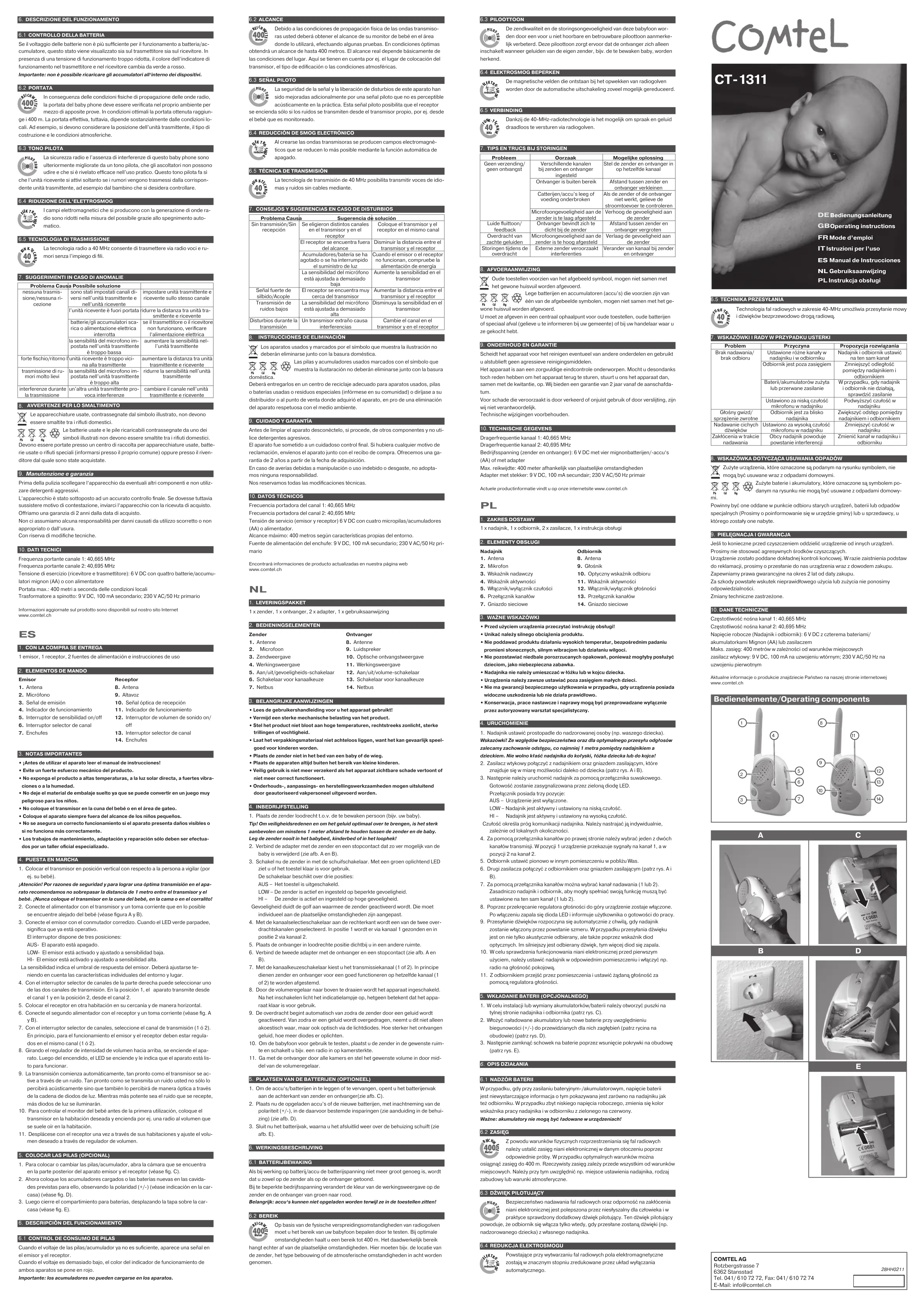 The 40-MHz radio technology enables the transmission of language and noises wirelessly by radio. 7. TROUBLESHOOTING TIPS AND TRICKSProblem Cause Suggestedsolutionno transmission/no receptiondifferent channels set on transmitter and receiverset the transmitter and the receiver to the same channelreceiver is outside range reduce the distance between receiver and transmitterbatteries/storage batteries empty or no power supplyif the transmitter or receiver does not function, check the electricity supply initially microphone sensitivity on transmitter set too lowincrease the sensitivity on the transmitterloud whistling sound/back couplingreceiver is too close to transmitterincrease the distance between receiver and transmitterquiet noises are transmittedmicrophone sensitivity on transmitter set too highreduce the sensitivity on the transmitterinterference during transmissionthird party transmitter causing interferencechange the channel on transmitter and receiver8. NOTES ON DISPOSAL Old units, marked with the symbol as illustrated, may not be disposed of in the household rubbish. Used rechargeable and non-rechargeable batteries which are marked with one of the symbols illustrated may not be disposed of in the household rubbish.You must take them to a collection point for old units, old batteries or special waste (enquire at your local authority) or the dealer from whom you bought them.9. CARE AND WARRANTYBefore cleaning the unit, disconnect it if necessary from other components; do not use aggressive cleaning agents.The unit has been carefully checked for defects. If nevertheless you do have cause for complaint, please send us the unit with your proof of purchase. We offer a 2 year warranty from date of purchase.We are not liable for damage arising from incorrect handling, improper use or wear and tear.We reserve the right to make technical modifications.10. TECHNICAL DATAChannel 1 – carrier frequency: 40.665 MHzChannel 2 – carrier frequency: 40.695 MHzOperating voltage (transmitter and receiver): 6 V DC with four AA batteries or power pack max. range: 400 metres depending on local conditionsWall power supply: secondary – 9 V DC, 100 mA; primary – 230 V AC/50 HzYou can find up-to-date product information on our website www.comtel.ch 1. CONTENU DE LA LIVRAISON1 x émetteur, 1 x récepteur, 2 x adaptateurs réseau, 1 x mode d‘emploi2. ÉLÉMENTS DE COMMANDEÉmetteur1. Antenne2. Microphone3. Indicateur d’émission4. Indicateur d’exploitation5. Interrupteur on/off/sensibilité6. Interrupteur de sélection des canaux7. Douille réseauRécepteur8. Antenne9. Haut-parleur10. Indicateur optique de réception11. Indicateur d’exploitation12. Interrupteur on/off/volume13. Interrupteur de sélection des canaux14. Douille réseau3. INDICATIONS IMPORTANTES•Lisezlemoded’emploiavanttouteutilisationdel’appareil!•Évitezdesoumettreleproduitàunefortecontraintemécanique.•Nesoumettezpasl’appareilàunetempératuretropélevée,àlalumièredirectedusoleil,àdefortesvibrationsniàl’humidité.•Nelaissezpasl’emballageposésanssurveillancecarilpeutreprésenterundan-gerpourlesenfants.•Neplacezpasl’émetteurdanslelitdubébéouàsaportée.•Assurez-vousquel’appareilrestetoujourshorsdelaportéedesenfants.•Lefonctionnemententoutesécuritén’estplusgarantilorsquel’appareilprésentedesdégâtsvisiblesounefonctionnepluscorrectement.•Lestravauxdemaintenance,deréglageetderéparationnedoiventêtreeffectuésqueparunatelieragréé.4. MISE EN SERVICE1. Installez l’émetteur verticalement par rapport à la personne à surveiller (votre bébé par exemple).Conseils ! Pour des raisons de sécurité et pour une émission optimale du bruit, nous vous recommandons de ne pas dépasser une distance de 1 mètre entre l’émetteur et le bébé. Ne placez jamais l’émetteur dans le lit du bébé, de l’enfant ou dans le parc !2. Branchez le bloc d’alimentation avec l’émetteur à une prise aussi éloignée que possible du bébé (voir les figures A et B).3. Allumer maintenant l’émetteur grâce à l’interrupteur coulissant. Un indicateur à LED qui s’allume vert vous indique que l’appareil est prêt à être utilisé. L’interrupteur dispose de trois positions :AUS – L’appareil est éteint.LOW – L’émetteur est activé et réglé à une faible sensibilité.HI – L’émetteur est activé et réglé à une sensibilité élevée. La sensibilité décrit le seuil de l’émetteur, qui est à adapter suivant les conditions locales.4. L’interrupteur de sélection des canaux sur le côté droit permet de choisir un des deux canaux de transmission. En position 1 l’appareil transmet sur le canal 1 et en position 2 sur le canal 25. Installez le récepteur dans une autre pièce et verticalement à côté de vous.6. Branchez le deuxième bloc d’alimentation avec le récepteur (16) à une prise (voir les figures A et B).7. Avec l’interrupteur de sélection des canaux, choisir le canal de transmission (1 ou 2). En principe l’émetteur et le récepteur sont à programmer sur le même ca-nal pour permettre une exploitation (1 ou 2).8. En tournant le régleur du volume du son vers le haut, l’appareil est activé. Lorsque la diode luminescente LED s’allume, l’appareil est prêt à l’emploi.9. Le transfert démarre automatiquement dès qu’un son active l’émetteur. Dès qu’un son est transféré, vous ne le remarquez pas uniquement de manière acoustique mais également visuelle grâce aux voyants lumineux. Plus le son émis est fort, plus le nombre de diodes allumées est élevé.10. Afin de vérifier le bon état de fonctionnement du baby-sitter électronique, instal-lez votre émetteur dans la pièce à surveiller et allumez, par exemple, une radio en sourdine. 11. Parcourez ensuite les pièces de votre appartement avec votre récepteur et réglez ce dernier au volume souhaité à l’aide du régleur de volume.5. INTRODUIRE LES PILES (OPTIONNEL)1. Pour intr