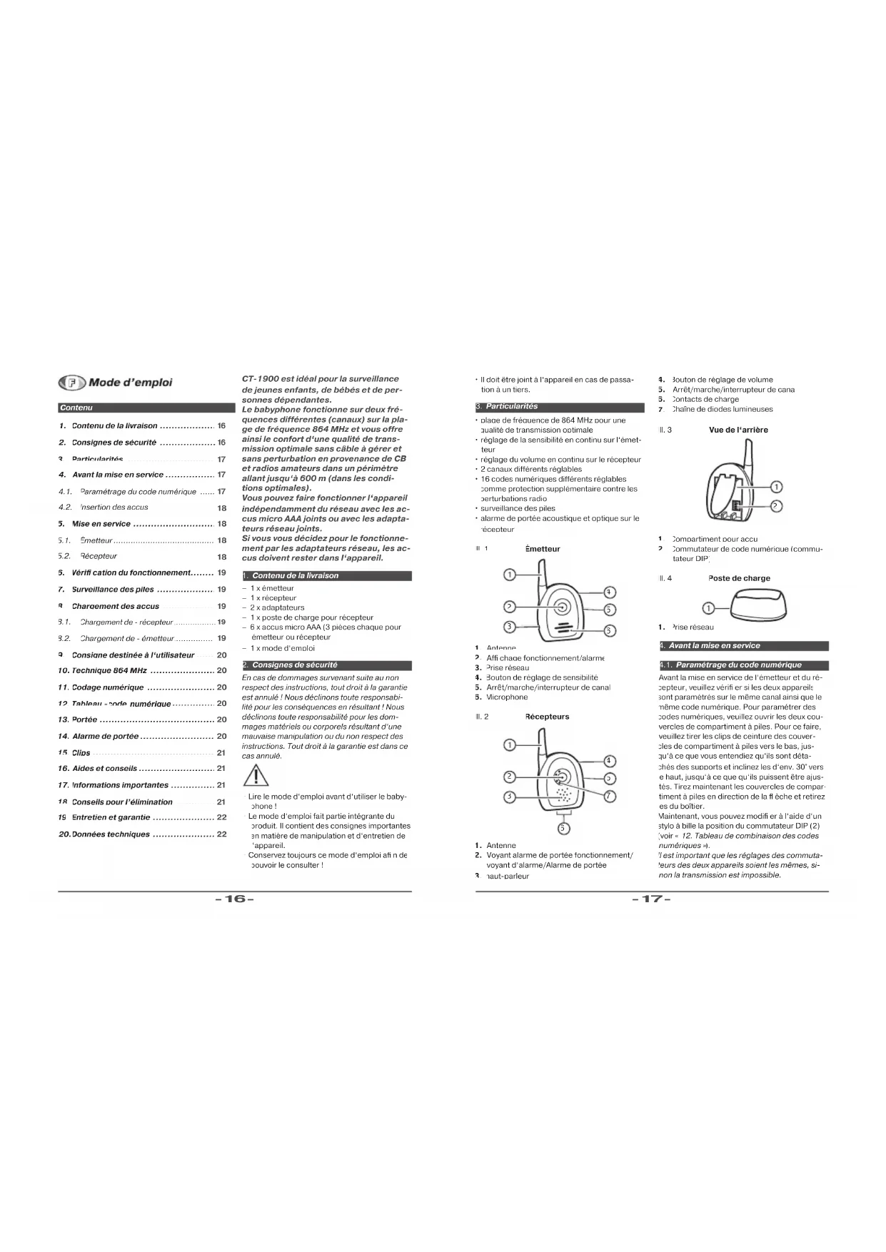 La sécurité radio et l'absence de perturbation du babylphone sont encore améliorées par un code numérique inaudible pour vous qui a fait ces prévenues. Le code permet d'allumer le récepteur uniquement lorsque des bruits sont porçus par le propre émettuer, par ex. le bébé à surveiller. CT-1900 dispose de 16 codes numériques différents, que vous pouvez regler un fonction de leur environnement à l'aide du commutateur DIP (voir III.3) de façon individuelé. L'activation du récepteur par un émetteur externe ou d'autres systèmes de surveillance de bébé est ainsi quasément excluc. Pour le cas rare où vous serré perturbé pendant la transmission par d'autres sources de signaux de la plage de fréquence 864 MHz, vous avez la possibility de passer de surcroît sur une autre canal.