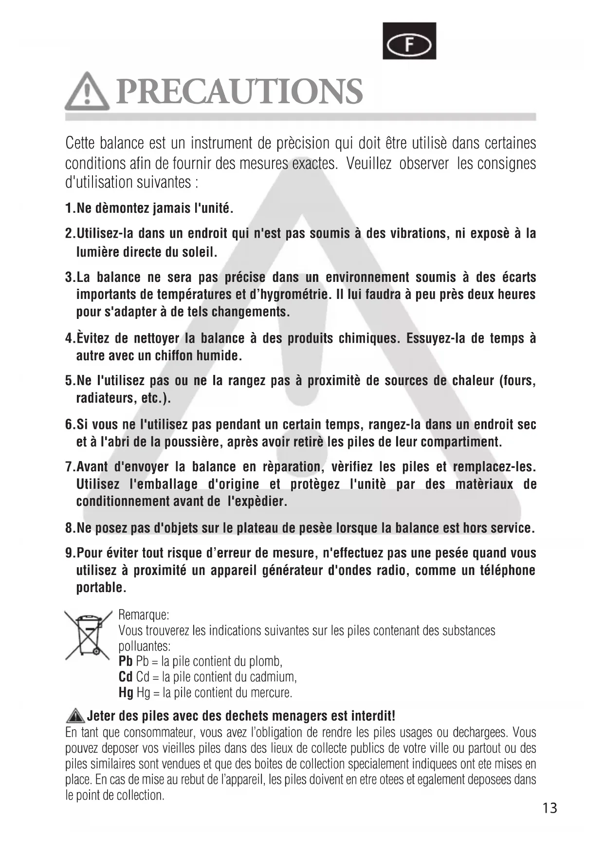 - Pour éviter tout risque d'erreur de mesure, n'effectuez pas une pesée quand vous utilisez à proximé un apparéil générateur d'ondes radio, comme un téléphone portable.