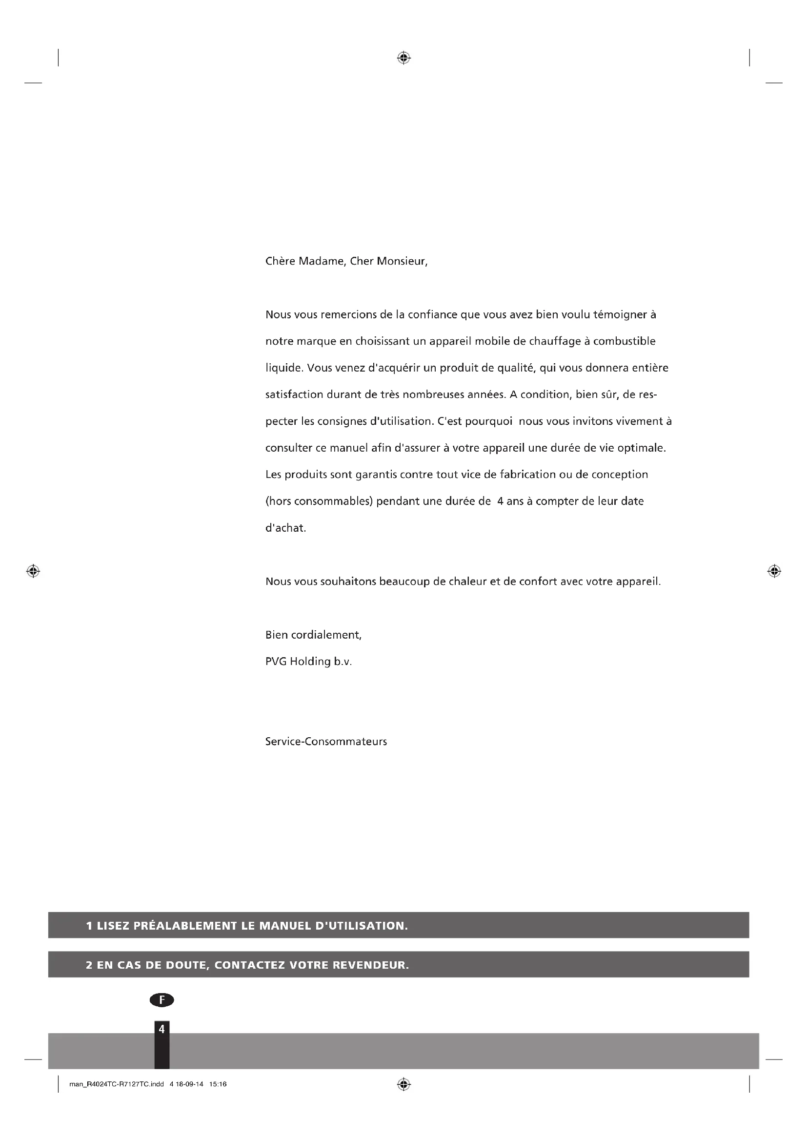 man_R4024TC-R7127TC.indd 1 18-09-14 15:16man_R4024TC-R7127TC.indd 2 18-09-14 15:16man_R4024TC-R7127TC.indd 3 18-09-14 15:164 Chère Madame, Cher Monsieur, Nous vous remercions de la confiance que vous avez bien voulu témoigner à notre marque en choisissant un appareil mobile de chauffage à combustible liquide. Vous venez d'acquérir un produit de qualité, qui vous donnera entière satisfaction durant de très nombreuses années. A condition, bien sûr, de res- pecter les consignes d'utilisation. C'est pourquoi nous vous invitons vivement à consulter ce manuel afin d'assurer à votre appareil une durée de vie optimale. Les produits sont garantis contre tout vice de fabrication ou de conception (hors consommables) pendant une durée de 4 ans à compter de leur date d'achat. Nous vous souhaitons beaucoup de chaleur et de confort avec votre appareil. Bien cordialement, PVG Holding b.v. Service-Consommateurs 1 Lisez préaLabLement Le manueL d'utiLisation. 2 en cas de doute, contactez votre revendeur.