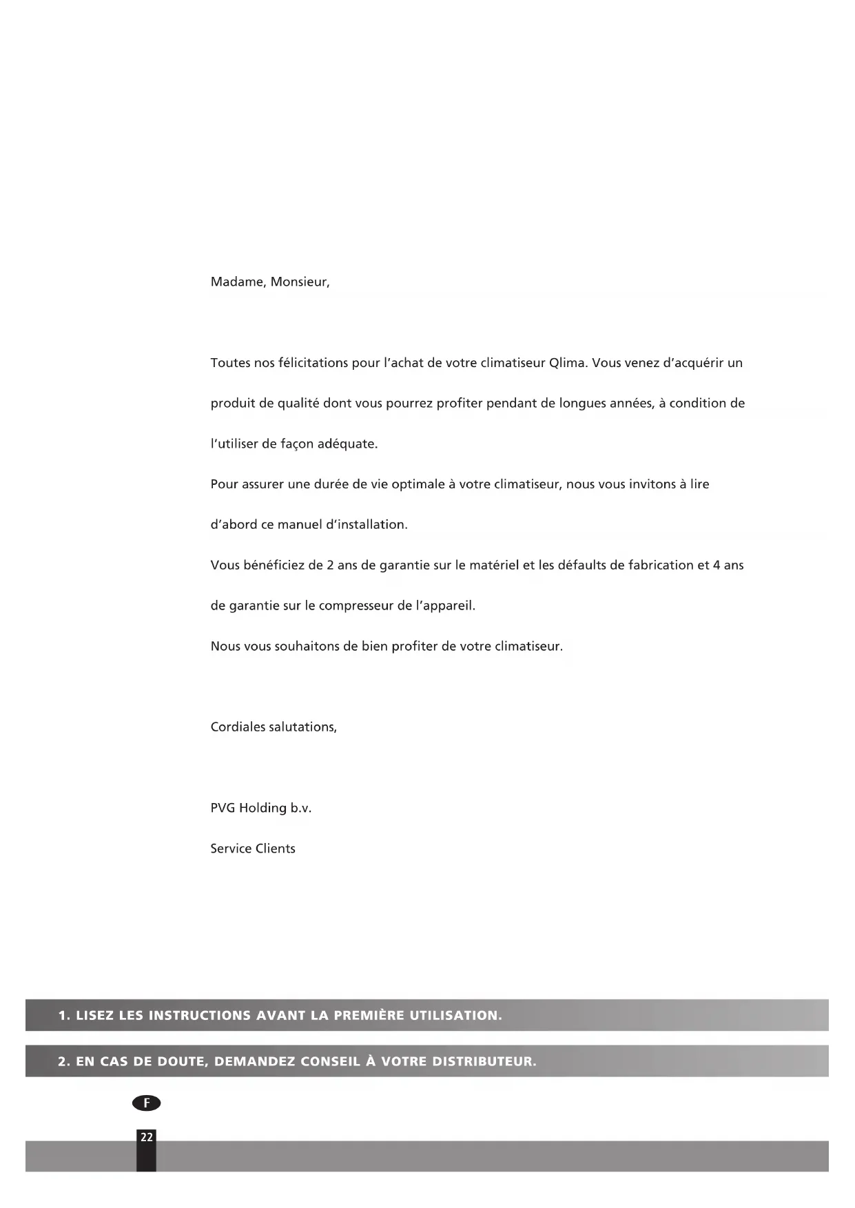 Madame, Monsieur, Toutes nos félicitations pour l’achat de votre climatiseur Qlima. Vous venez d’acquérir un produit de qualité dont vous pourrez profiter pendant de longues années, à condition de l’utiliser de façon adéquate. Pour assurer une durée de vie optimale à votre climatiseur, nous vous invitons à lire d’abord ce manuel d’installation. Vous bénéficiez de 2 ans de garantie sur le matériel et les défaults de fabrication et 4 ans de garantie sur le compresseur de l’appareil. Nous vous souhaitons de bien profiter de votre climatiseur. Cordiales salutations, PVG Holding b.v. Service Clients3