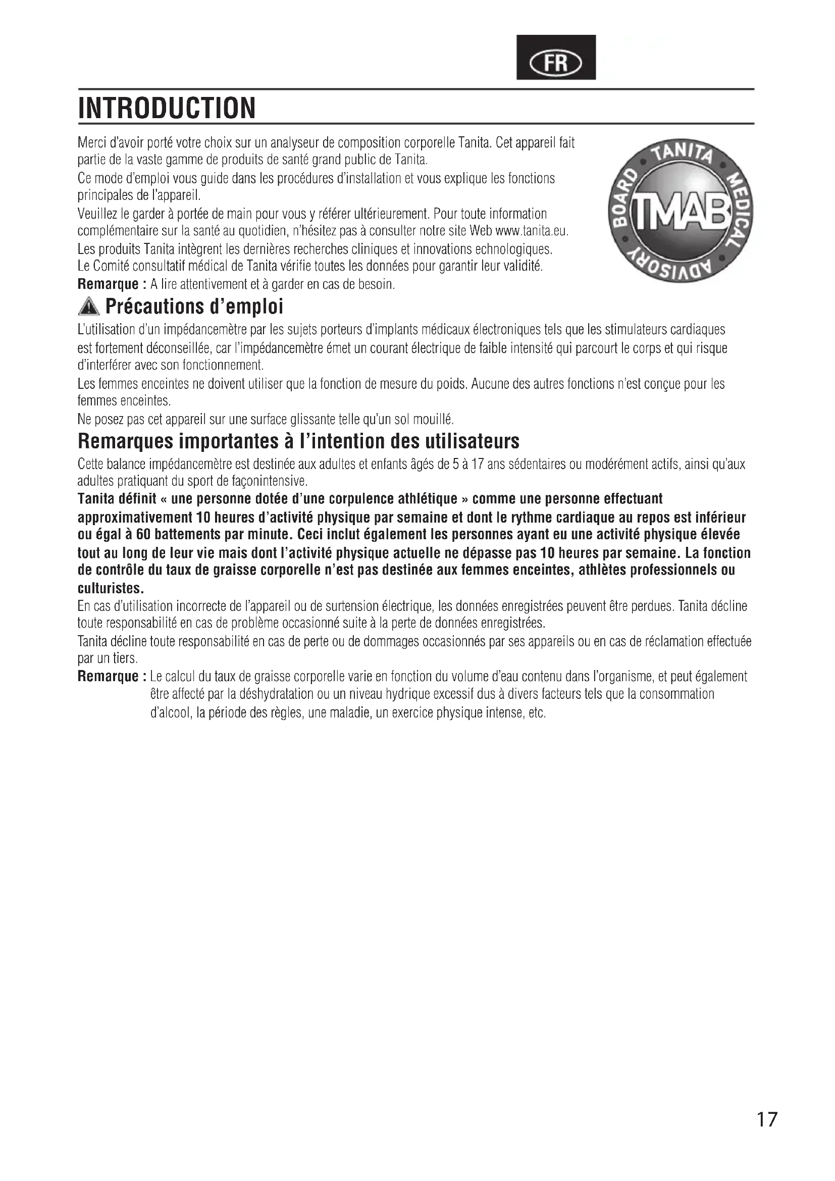 Teilung der Körperfettanzeige 0.1% Persönliche Daten 5 Speicherplätze Stromversorgung 4 AAA Batterien (mitgeliefert) Stromverbrauch 30 mA Messstrom 50 kHz, 6.25 kHz, 100 µA Batterien dürfen nicht in den Hausmüll! Als Verbraucher sind Sie gesetzlich verpflichtet, gebrauchte oder ausge- laufene. Batterien zurückzugeben. Sie können Ihre alten Batterien bei den öffentlichen. Sammelstellen in Ihrer Stadt oder überall dort abgeben, wo Batterien der betreffenden Art verkauft werden und speziell gekennzeich- nete Sammelbehälter aufgestellt sind. Bei Verschrottung des Gerätes sind die Batterien zu entnehmen und müssen ebenfalls bei Sammelstellen abgegebenwerden. Hinweis: Diese Zeichen finden Sie auf schadstoffhaltigen Batterien: Pb Pb = Batterie enthält Blei, Cd Cd = Batterie enthält Cadmium, Hg Hg = Batterie enthält Quecksilber. Dieses Gerät entspricht der EMV-Richtlinie 2004/108/EG und der RoHS-Richtlinie 2011/65/EU.17 INTRODUCTION Merci d’avoir porté votre choix sur un analyseur de composition corporelle Tanita. Cet appareil fait partie de la vaste gamme de produits de santé grand public de Tanita. Ce mode d’emploi vous guide dans les procédures d’installation et vous explique les fonctions principales de l’appareil. Veuillez le garder à portée de main pour vous y référer ultérieurement. Pour toute information complémentaire sur la santé au quotidien, n’hésitez pas à consulter notre site Web www.tanita.eu. Les produits Tanita intègrent les dernières recherches cliniques et innovations echnologiques. Le Comité consultatif médical de Tanita vérifie toutes les données pour garantir leur validité. Remarque : A lire attentivement et à garder en cas de besoin. Précautions d’emploi L’utilisation d’un impédancemètre par les sujets porteurs d’implants médicaux électroniques tels que les stimulateurs cardiaques est fortement déconseillée, car l’impédancemètre émet un courant électrique de faible intensité qui parcourt le corps et qui risque d’interférer avec son fonctionnement. Les femmes enceintes ne doivent utiliser que la fonction de mesure du poids. Aucune des autres fonctions n’est conçue pour les femmes enceintes. Ne posez pas cet appareil sur une surface glissante telle qu’un sol mouillé. Remarques importantes à l’intention des utilisateurs Cette balance impédancemètre est destinée aux adultes et enfants âgés de 5 à 17 ans sédentaires ou modérément actifs, ainsi qu’aux adultes pratiquant du sport de façonintensive. Tanita définit « une personne dotée d’une corpulence athlétique » comme une personne effectuant approximativement 10 heures d’activité physique par semaine et dont le rythme cardiaque au repos est inférieur ou égal à 60 battements par minute. Ceci inclut également les personnes ayant eu une activité physique élevée tout au long de leur vie mais dont l’activité physique actuelle ne dépasse pas 10 heures par semaine. La fonction de contrôle du taux de graisse corporelle n’est pas destinée aux femmes enceintes, athlètes professionnels ou culturistes. En cas d’utilisation incorrecte de l’appareil ou de surtension électrique, les données enregistrées peuvent être perdues. Tanita décline toute responsabilité en cas de problème occasionné suite à la perte de données enregistrées. Tanita décline toute responsabilité en cas de perte ou de dommages occasionnés par ses appareils ou en cas de réclamation effectuée par un tiers. Remarque : Le calcul du taux de graisse corporelle varie en fonction du volume d’eau contenu dans l’organisme, et peut également être affecté par la déshydratation ou un niveau hydrique excessif dus à divers facteurs tels que la consommation d’alcool, la période des règles, une maladie, un exercice physique intense, etc.18 Insertion des piles Ouvrez la trappe du réceptacle situé sous le plateau de pesée et insérez les piles comme indiqué. Remarque : assurez-vous que les piles sont placées dans le bon sens, en respectant la polarité. Si elles ne sont pas dans la bonne position, elles risquent de couler et d’endommager le plancher. En cas de non-utilisation prolongée, il est conseillé de retirer les piles de l’appareil. Les piles étant insérées lors de la fabrication, il est possible que leur niveau d’énergie soit légèrement diminué. Positionnement de l’appareil Placez le plateau de pesée sur une surface dure et plane présentant un niveau de vibrations minimal, ceci afin d’assurer une mesure exacte, en toute sécurité. Remarque : pour des raisons de sécurité, évitez de marcher sur les bords du plateau. Conseils de manipulation Cet appareil est un instrument de précision faisant appel à des technologies de pointe. Pour maintenir l’appareil dans des conditions optimales d’utilisation, suivez les indications suivantes :