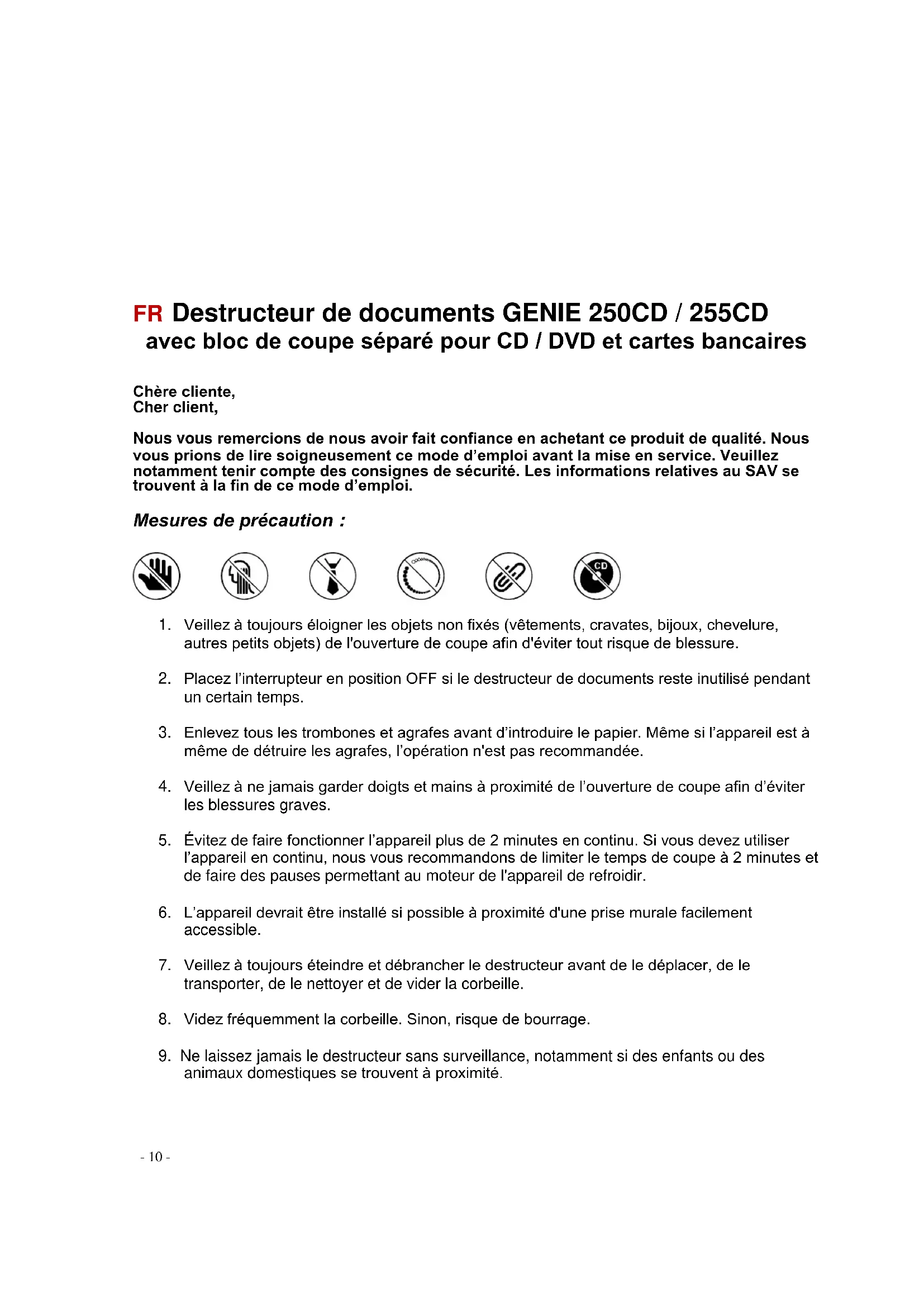 vider la corbeille ou si le destructeur est inutilisé pendant un certain temps.- 12 - Cet appareil est uniquement conçu pour l’usage privé dans des locaux fermés et pour un fonctionnement ne dépassant pas 2 minutes. N’utilisez pas ce destructeur de documents pour un usage professionnel ou en plein air. Le destructeur de documents est également doté d’un interrupteur « Clear ». Appuyez sur cet interrupteur si l’opération de coupe s’arrête avant la destruction complète du papier. L’interrupteur Clear assure le transport intégral du papier dans la corbeille. Capacité du destructeur : Le 250CD / 255CD peut couper jusqu’à 7 feuilles de papier (DIN A4, 70 g). Largeur de coupe maximale : 22 cm. Si vous détruisez des petits formats (enveloppes par exemple, ou facturettes de carte bancaire), introduisez-les dans le centre de l'ouverture de coupe. Veillez à ne jamais introduire dans le bloc de coupe une quantité de papier supérieure au volume maximal indiqué ci-dessus. Cela risquerait d’endommager l’appareil. Bloc de coupe séparé pour CD et cartes bancaires : Ce destructeur de documents est équipé d’un bloc de coupe séparé pour CD, DVD et cartes bancaires. Les CD et DVD sont coupés en 4 morceaux. Comme il est toujours possible que ces matériaux produisent des éclats, veillez à ne pas approcher votre visage de l’appareil quand vous introduisez des CD ou des DVD. Les morceaux sont recueillis dans un réceptacle particulier, ce qui facilite l’élimination dans le respect de l'environnement !