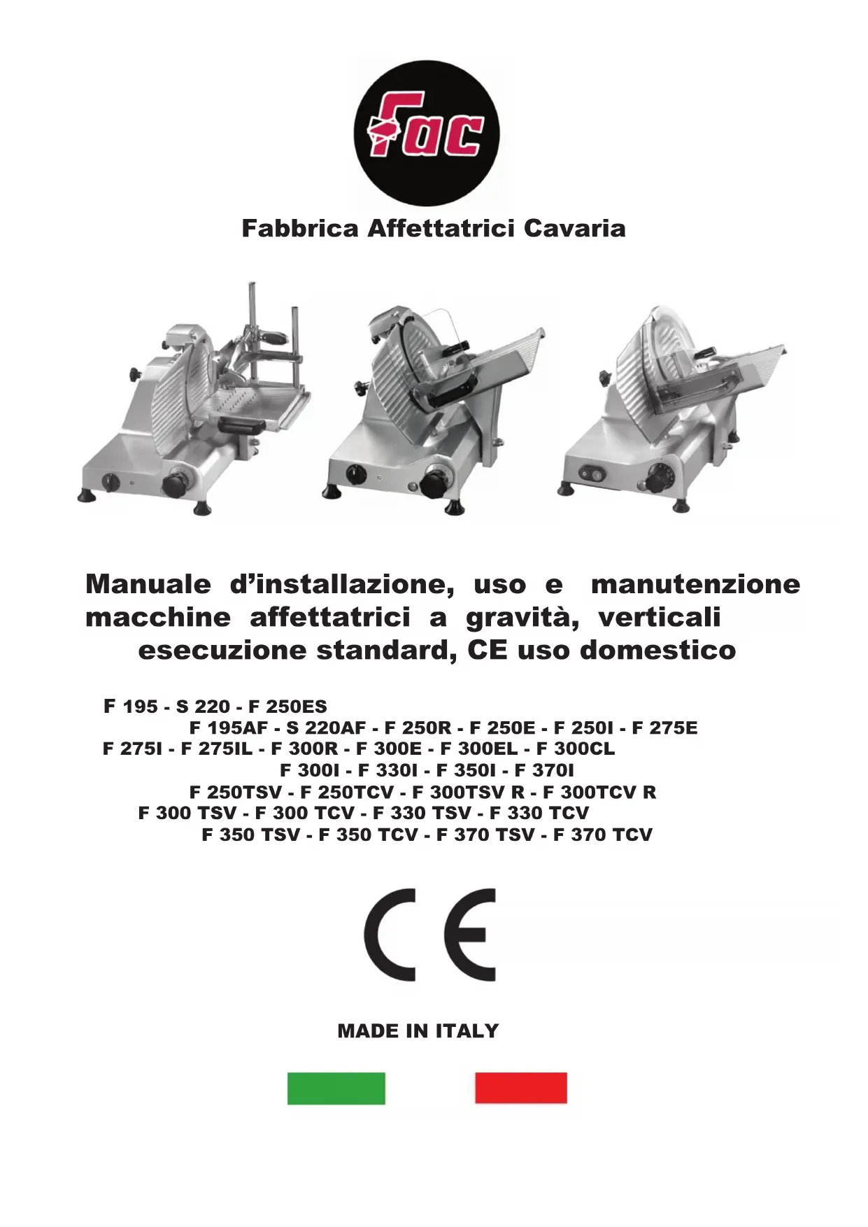 Téléchargez la notice de votre Trancheuse au format PDF gratuitement ! Retrouvez votre notice F 250ES - FAC et reprennez votre appareil électronique en main. Sur cette page sont publiés tous les documents nécessaires à l'utilisation de votre appareil F 250ES de la marque FAC.