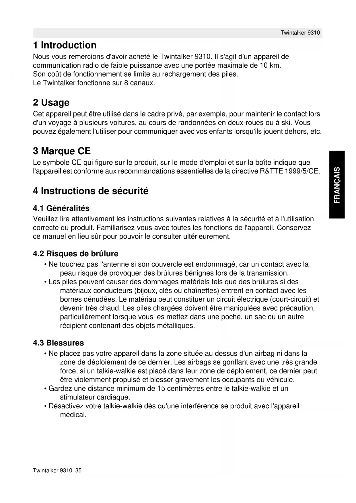 Nous vous remercions d'avoir acheté le Twintalker 9310. Il s'agit d'un apparéil de communication radio de faible puissance avec une portée maximale de 10km . Son coût de fonctionnement se limite au rechargement des piles. Le Twintalker fonctionne sur 8 canaux.
