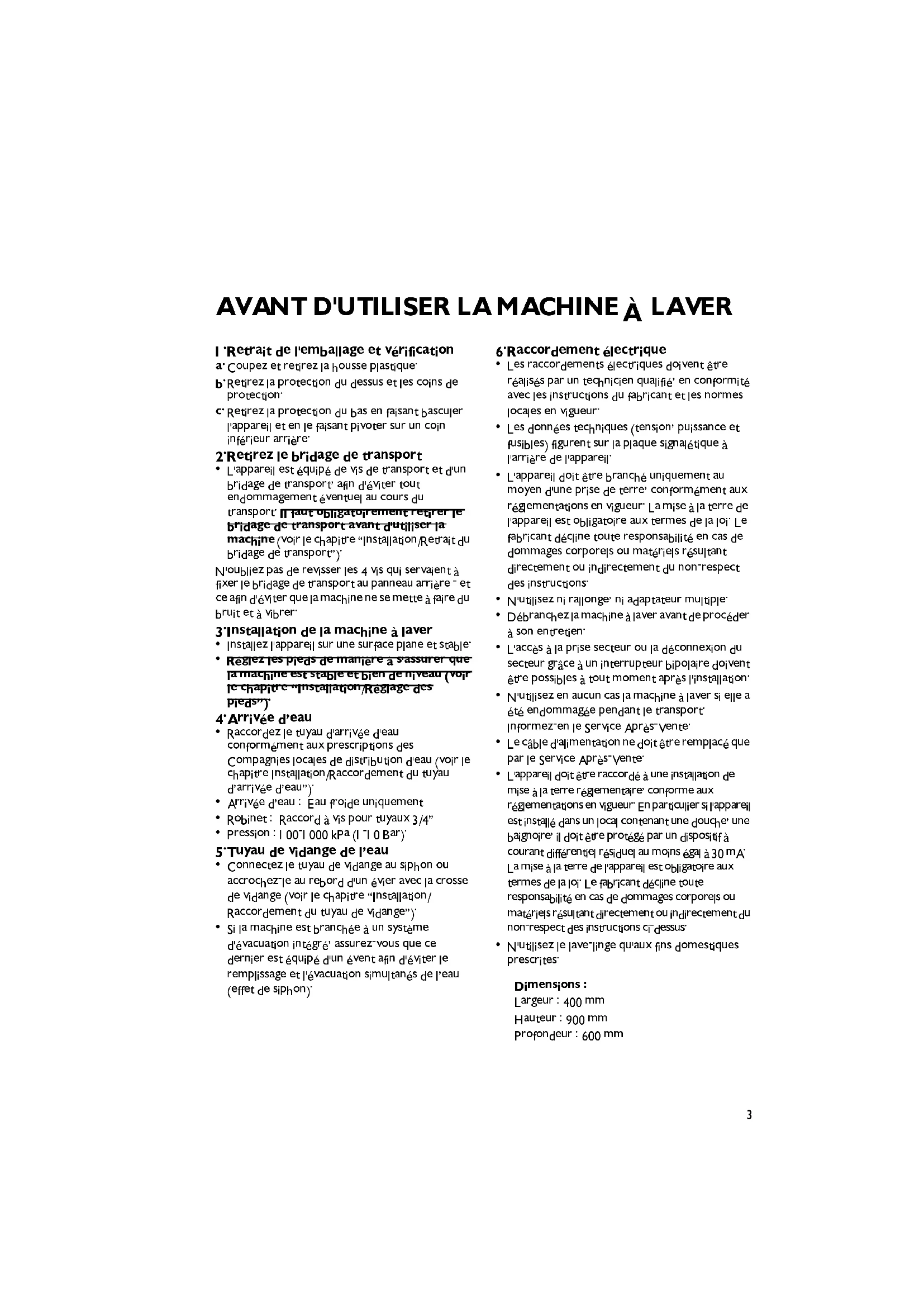 N'utilisez le lave-linge qu'aux fins domestiques prescrites. Dimensions : Largeur : 400 mm Hauteur : 900 mm Profondeur : 600 mm4