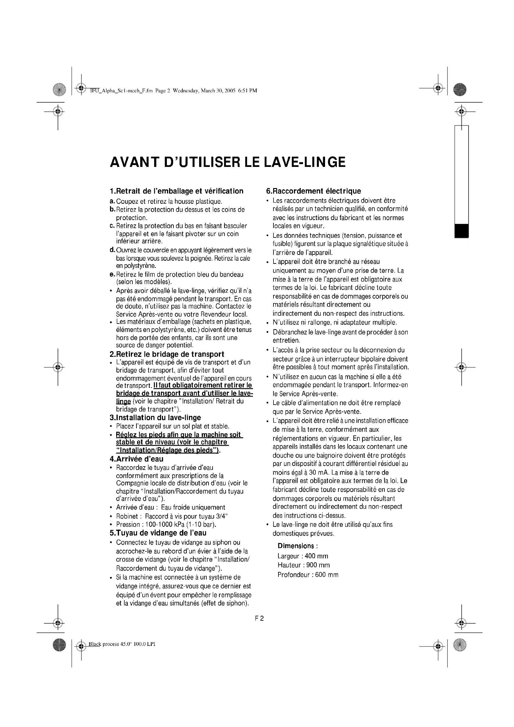 Le lave-linge ne doit être utilisé qu’aux fins domestiques prévues. Dimensions : Largeur : 400 mm Hauteur : 900 mm Profondeur : 600 mm IFU_Alpha_Sc1-mech_F.fm Page 2 Wednesday, March 30, 2005 6:51 PM Black process 45.0° 100.0 LPIF 3