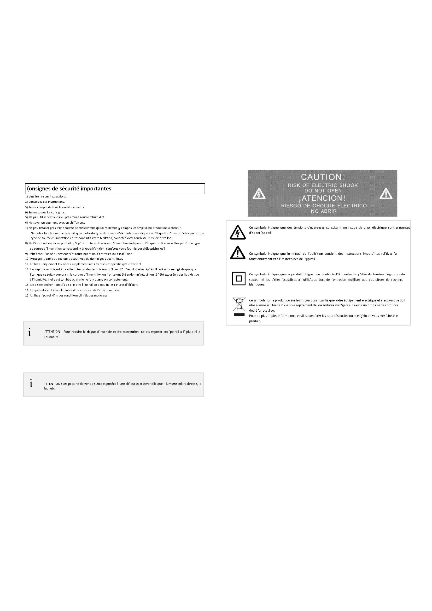 ATTENTION : Pour réduire le risque d’incendie et d’électrocution, ne pas exposer cet appareil à la pluie ni à l’humidité.