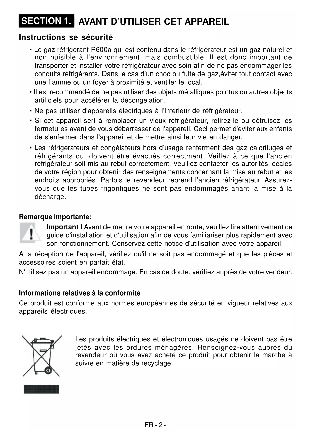 - Le gaz réfrigérant R600a qui est contenu dans le réfrigerateur est un gaz naturel et non nuisible à l'environnement, mais combustible. Il est donc important de transporter et installer votre réfrigerateur avec soin afin de ne pas endommager les conduits réfrigerants. Dans le cas d'un choc ou fuite de gaz, éviter tout contact avec une flamme ou un foyer à proximé et ventiler le local.