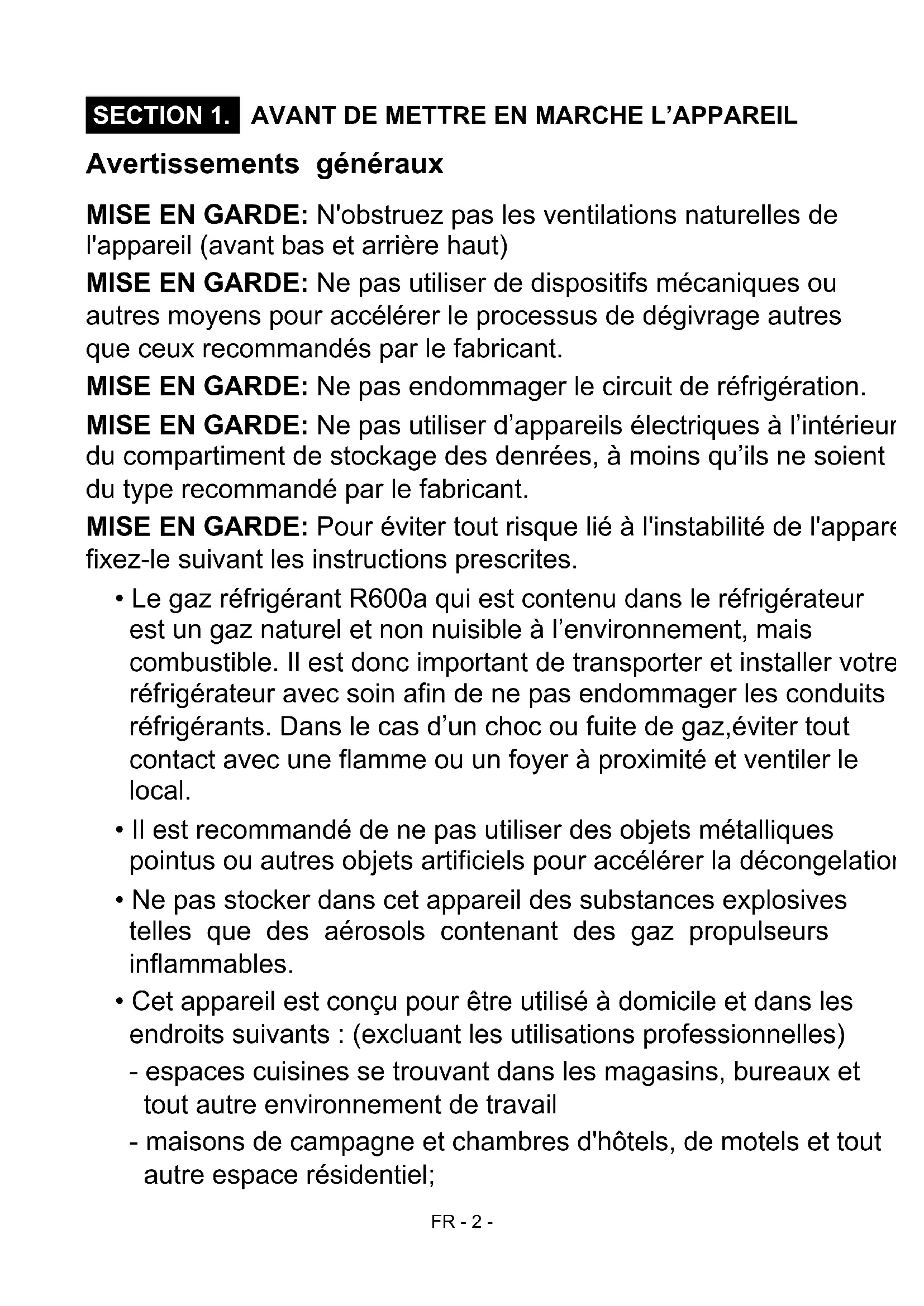 - Le gaz réfrigérant R600a qui est contenu dans le réfrigérateur est un gaz naturel et non nuisible à l'environnement, mais combustible. Il est donc important de transporter et installer votre réfrigérateur avec soin afin de ne pas endommager les conduits réfrigérants. Dans le cas d'un choc ou fuite de gaz, éviter tout contact avec une flamme ou un foyer à proximité et ventiler le local.