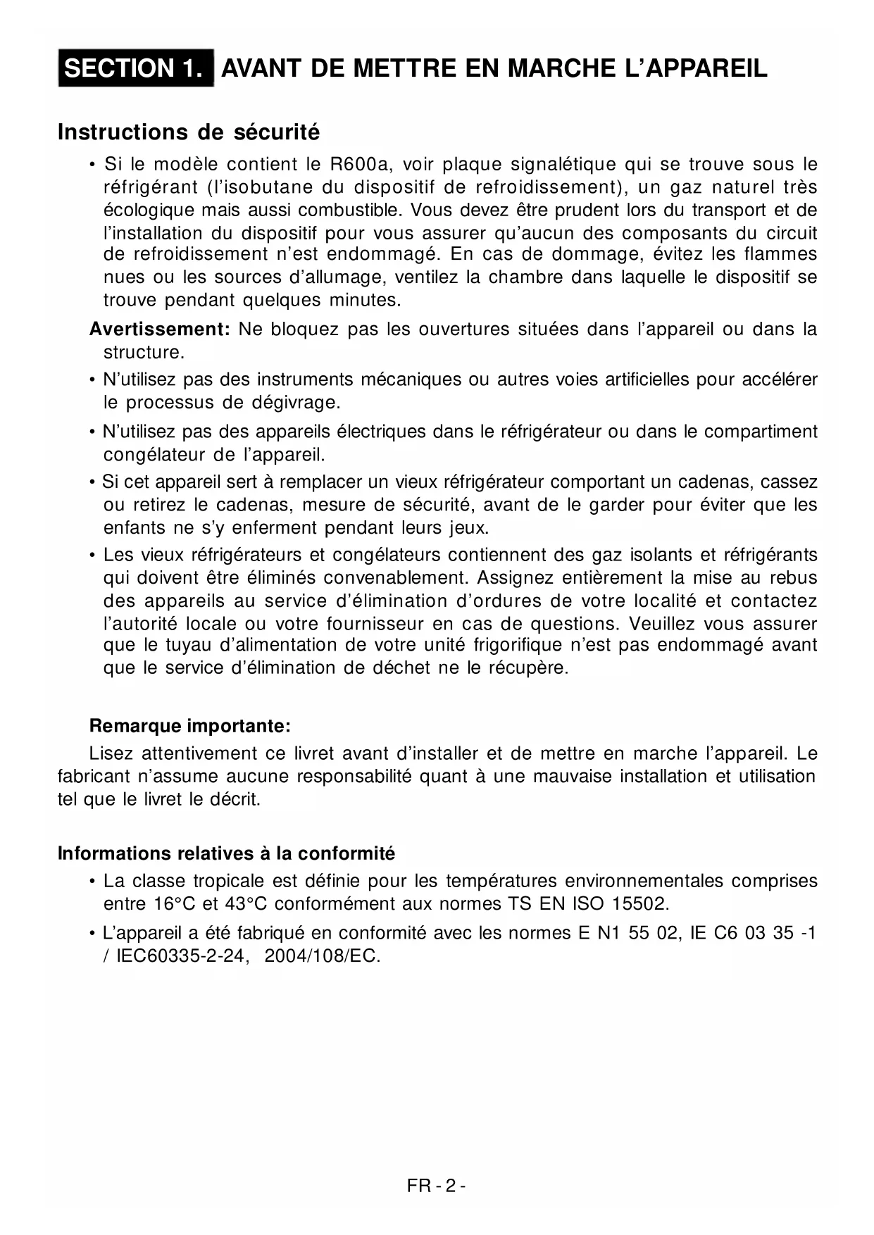 SECTION 1. AVANT DE METTRE EN MARCHE L'APPAREIL