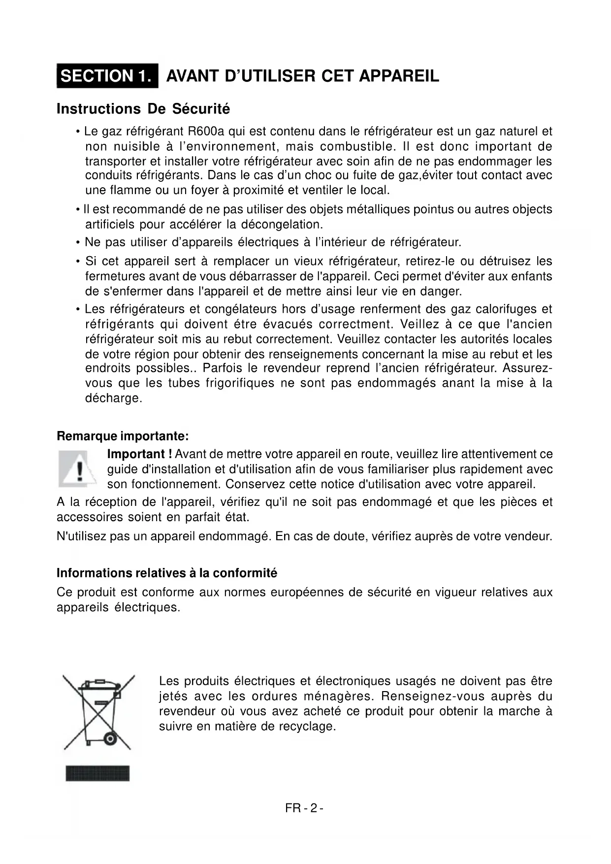 - Le gaz réfrigérant R600a qui est contenu dans le réfrigerateur est un gaz naturel et non nuisible à l'environnement, mais combustible. Il est donc important de transporter et installer votre réfrigerateur avec soin afin de ne pas endommager les conduits réfrige-rants. Dans le cas d'un choc ou fuite de gaz, éviter tout contact avec une flamme ou un foyer à proximité et ventiler le local.