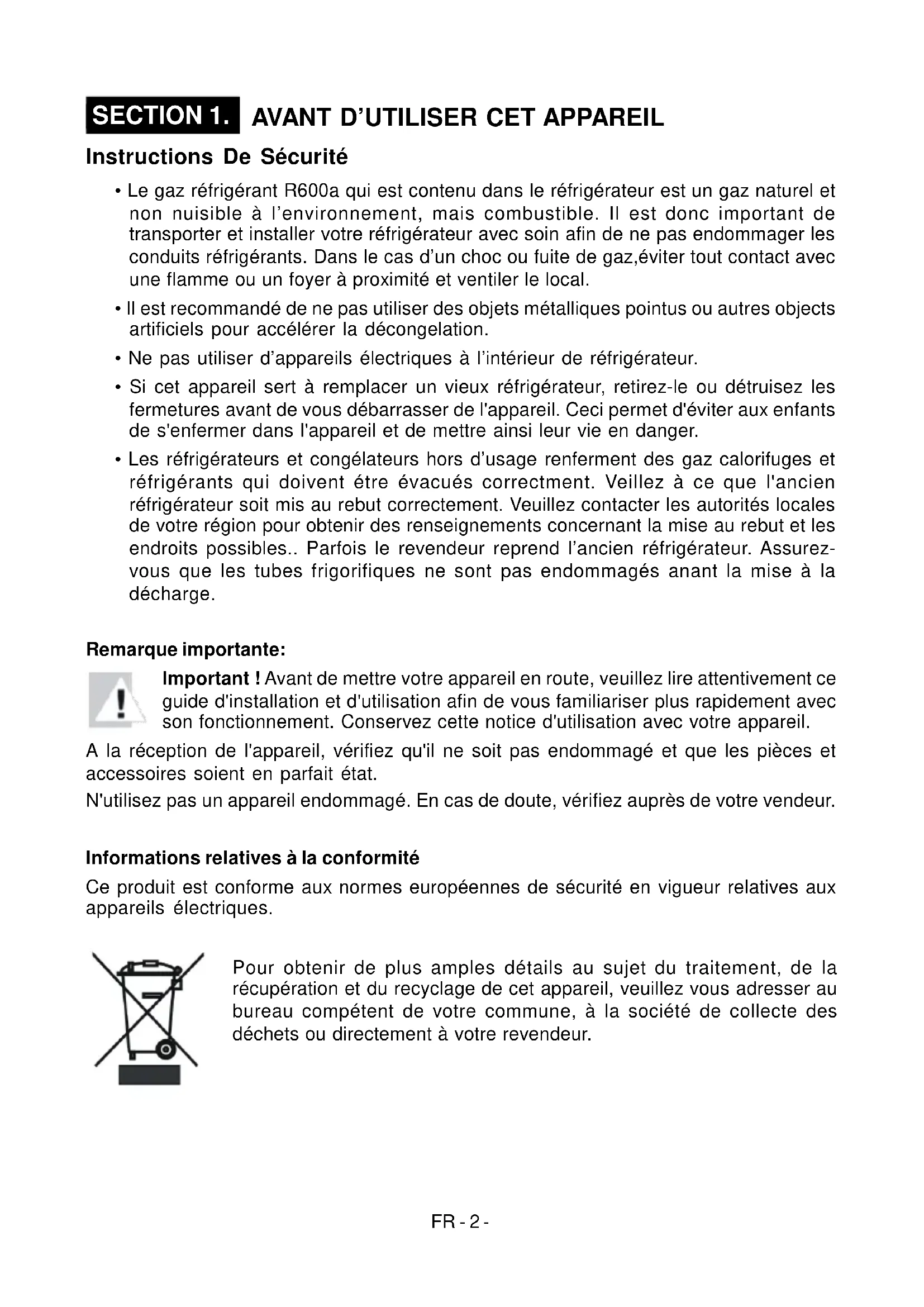 - Le gaz réfrigérant R600a qui est contenu dans le réfrigerateur est un gaz naturel et non nuisible à l'environnement, mais combustible. Il est donc important de transporter et installer votre réfrigerateur avec soin afin de ne pas endommager les conduits réfrige-rants. Dans le cas d'un choc ou fuite de gaz, éviter tout contact avec une flamme ou un foyer à proximité et ventiler le local.
