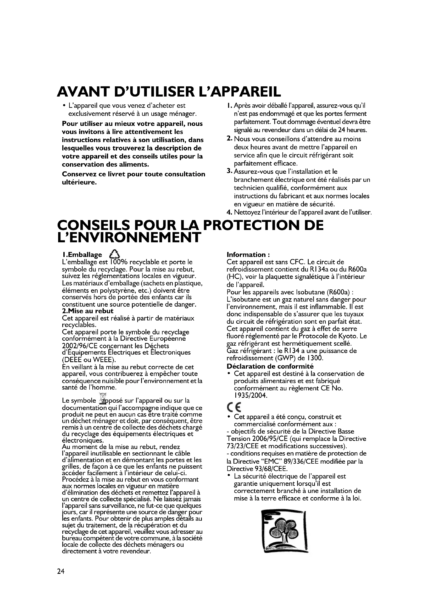 Nettoyez l’intérieur de l’appareil avant de l’utiliser. 1.Emballage L’emballage est 100% recyclable et porte le symbole du recyclage. Pour la mise au rebut, suivez les réglementations locales en vigueur. Les matériaux d’emballage (sachets en plastique, éléments en polystyrène, etc.) doivent être conservés hors de portée des enfants car ils constituent une source potentielle de danger. 2.Mise au rebut Cet appareil est réalisé à partir de matériaux recyclables. Cet appareil porte le symbole du recyclage conformément à la Directive Européenne 2002/96/CE concernant les Déchets d’Équipements Électriques et Électroniques (DEEE ou WEEE). En veillant à la mise au rebut correcte de cet appareil, vous contribuerez à empêcher toute conséquence nuisible pour l’environnement et la santé de l’homme. Le symbole apposé sur l’appareil ou sur la documentation qui l’accompagne indique que ce produit ne peut en aucun cas être traité comme un déchet ménager et doit, par conséquent, être remis à un centre de collecte des déchets chargé du recyclage des équipements électriques et électroniques. Au moment de la mise au rebut, rendez l’appareil inutilisable en sectionnant le câble d’alimentation et en démontant les portes et les grilles, de façon à ce que les enfants ne puissent accéder facilement à l’intérieur de celui-ci. Procédez à la mise au rebut en vous conformant aux normes locales en vigueur en matière d’élimination des déchets et remettez l’appareil à un centre de collecte spécialisé. Ne laissez jamais l’appareil sans surveillance, ne fut-ce que quelques jours, car il représente une source de danger pour les enfants. Pour obtenir de plus amples détails au sujet du traitement, de la récupération et du recyclage de cet appareil, veuillez vous adresser au bureau compétent de votre commune, à la société locale de collecte des déchets ménagers ou directement à votre revendeur. Information : Cet appareil est sans CFC. Le circuit de refroidissement contient du R134a ou du R600a (HC), voir la plaquette signalétique à l’intérieur de l’appareil. Pour les appareils avec Isobutane (R600a) : L’isobutane est un gaz naturel sans danger pour l’environnement, mais il est inflammable. Il est donc indispensable de s’assurer que les tuyaux du circuit de réfrigération sont en parfait état. Cet appareil contient du gaz à effet de serre fluoré réglementé par le Protocole de Kyoto. Le gaz réfrigérant est hermétiquement scellé. Gaz réfrigérant : le R134 a une puissance de refroidissement (GWP) de 1300. Déclaration de conformité