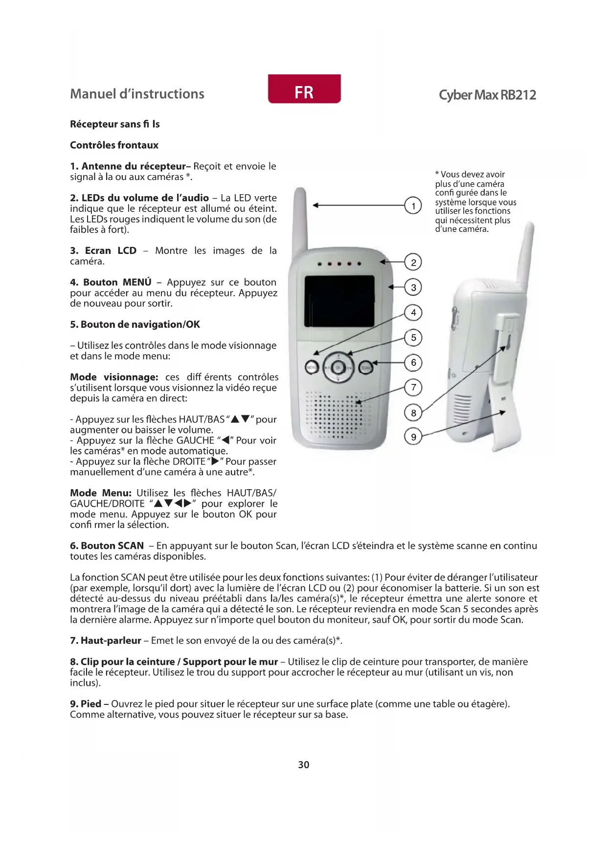 La fonction SCAN peut être utilisé pour les deux fonctions suivantes: (1) Pour éviter de déranger l'utilisateur (par exemple, lorsqu'il dort) avec la lumière de l'écran LCD ou (2) pour économiser la batterie. Si un son est détecté au-dessus du niveau prétabli dans la/les camera(s)*, le récepteur émettra une alerte sonore et montrera l'image de laamera qui a détecté le son. Le récepteur reviendra en mode Scan 5 secondes après la dernière alarme. Appuyez sur n'importe quel bouton du moniteur, sauf OK, pour sortir du mode Scan.