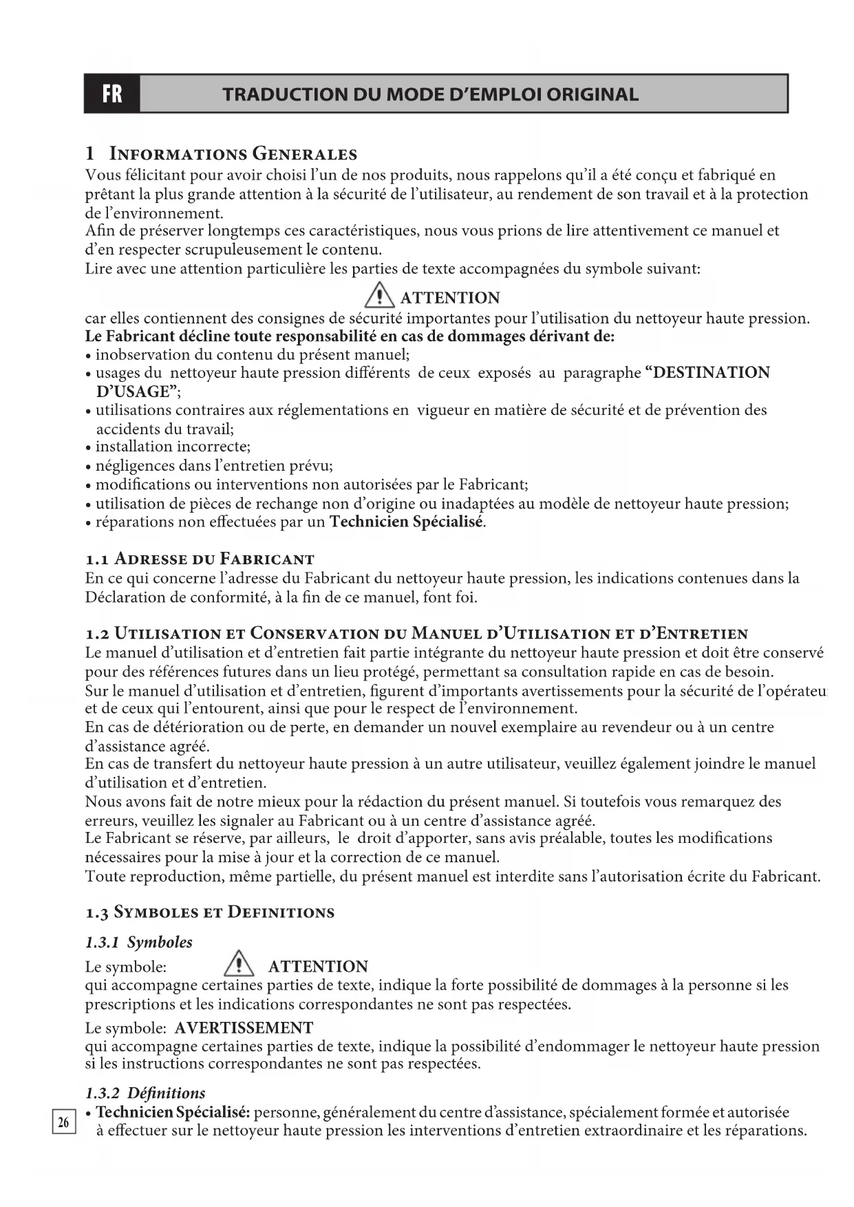 car elles contiennent des consignes de sécurité importantes pour l'utilisation du nettoyeur haute pression. Le Fabricant decline toute responsabilité en cas de dommages dessistant de: