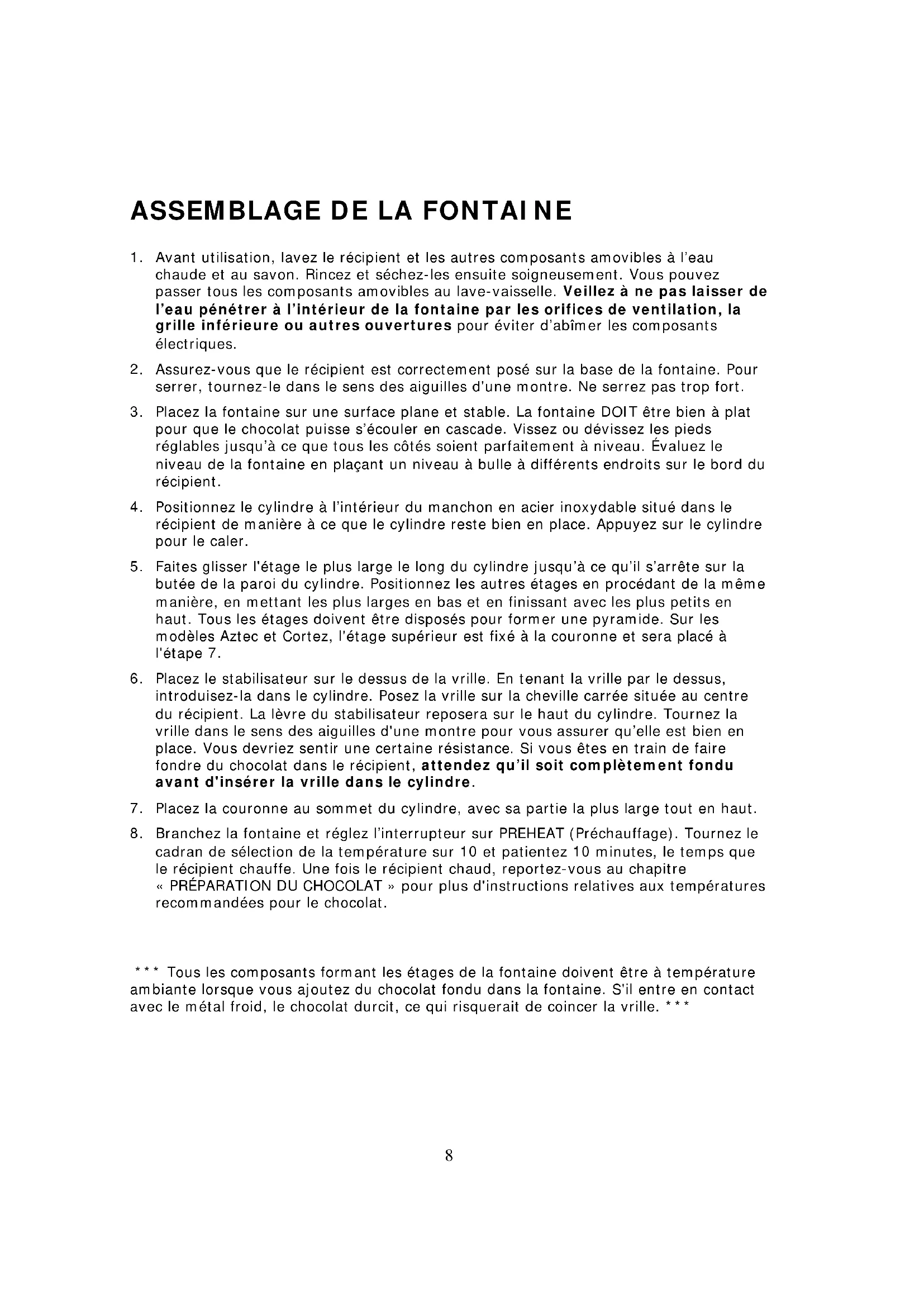 tous les composants qui entrent en contact avec le chocolat après chaque utilisation. Tous les composants formant les étages (le cylindre, les étages, la couronne et la vrille) peuvent passer au lave-vaiselle, en prenant soin de les laver préalablement dans de l'eau chaude savonneuse pour ôter l'excedent de chocolat. Il importe de laver le récipient à l'eau chaude et au savon après chaque utilisation, en faisant attention à ne pas faire pénétrer de l'eau sur ou à l'intérieur du boîtier de la fontaine. Il est également conseillé d'utiliser un agent désinfectant après avoir lavé les composants de la fontaine.