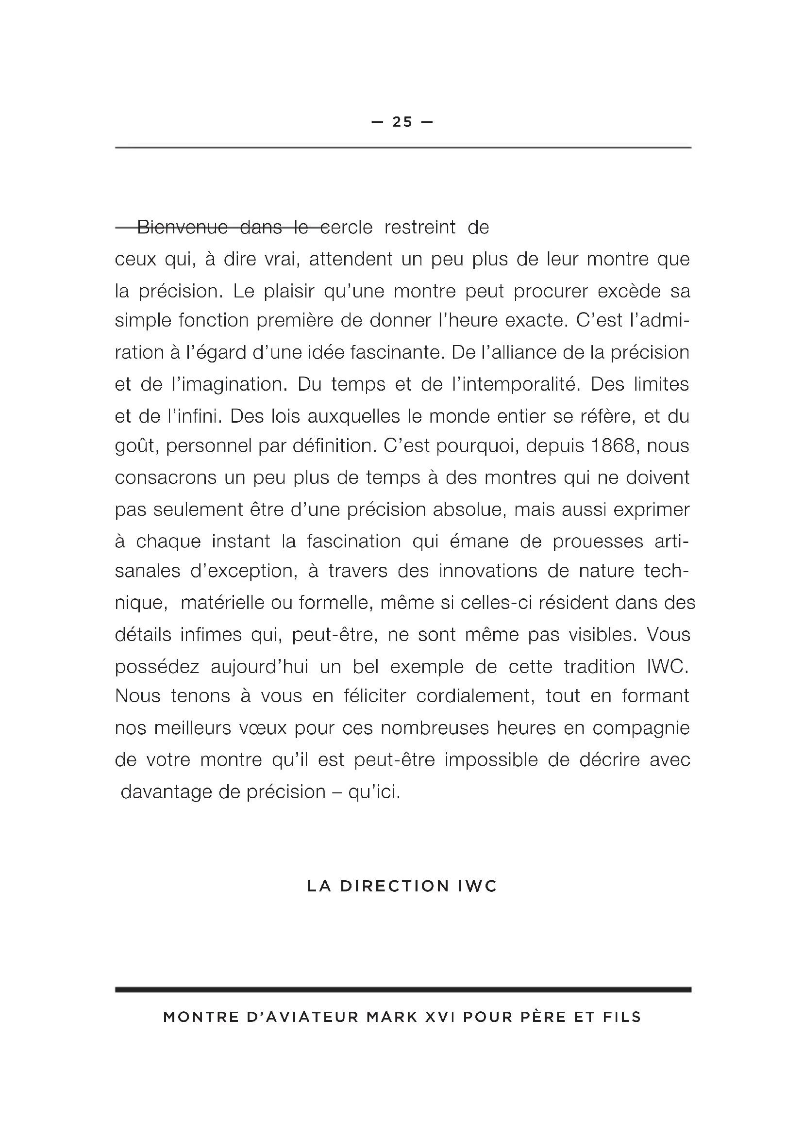 1— 28 — Montre d’aViateur Mark XVi pour pÈre et FilS leS FonctionS de la couronne X — Position normale (couronne vissée) 0 — Position de remontage 1 — Réglage de la date 2 — Réglage de l’heure la poSition norMale Cette montre possède une couronne vissée. Ce dispositif (posi- tion normale, X) empêche de dérégler involontairement l’heure ou la date et, de surcroît, il assure une double protection du boîtier contre les infiltrations d’eau. Pour libérer la couronne, il faut la tourner à gauche, ce qui la met automatiquement en position 0, la position de remontage. Vous revisserez la couronne en exerçant une pression pour la ramener en position X tout en la tournant à droite, ce qui la verrouille. X 0 1 2— 29 — Montre d’aViateur Mark XVi pour pÈre et FilS la poSition de reMontage Dans la position de remontage (0), vous pouvez aussi remonter manuellement le mouvement automatique. Quelques tours de la couronne suffisent à actionner le mouvement. Toutefois, nous re- commandons de remonter la montre en faisant tourner environ 20 fois la couronne afin de garantir une précision maximale. le réglage de la date Si le mois compte moins de 31 jours, vous devez avancer ma- nuellement la date au premier jour du mois suivant. Pour ce faire, libérez la couronne vissée et tirez-la en position 1. En la tournant à gauche, vous pouvez maintenant régler la date (correction ra- pide). Ne procédez jamais à cette correction entre 20 et 2 heures du matin, car, durant cette période, le mouvement fait avancer automatiquement la date.— 30 — Montre d’aViateur Mark XVi pour pÈre et FilS le réglage de l’heure Tirez la couronne en position 2. Cette opération arrête le mouve- ment. Pour un réglage à la seconde près, il est préférable d’arrê- ter le mouvement lorsque l’aiguille des secondes se trouve sur 60. Avancez alors l’aiguille des minutes de quelques traits au-delà de l’heure à régler. Positionnez ensuite l’aiguille des minutes par un léger mouvement en arrière exactement sur le trait des minutes désiré. Ce mode de réglage garantit que l’aiguille des minutes se déplacera immédiatement lors du redémarrage du mouvement. Pour faire démarrer l’aiguille des secondes, il faut remettre la couronne en position 0. Lors du réglage de l’heure, veuillez tenir compte du changement de date qui intervient à chaque fois à minuit (24 heures). Si ce changement est déjà intervenu à midi (12 heures), vous devez avancer les aiguilles de 12 heures. Important: dans les positions 0, 1 et 2, la montre est certes étanche, mais la couronne doit toujours être revissée (position X) avant toute utilisation normale.— 31 — Montre d’aViateur Mark XVi pour pÈre et FilS lire l’heure danS l’oBScurité Le cadran ainsi que l’aiguille des heures et celle des minutes de votre montre sont munis d’éléments luminescents vous permet- tant de lire parfaitement l’heure, même dans l’obscurité la plus totale. Le triangle marqué à 12 heures sert à vous orienter. l’étanchéité Pour les montres IWC, l’indication de l’étanchéité est faite en bar et non en mètres. Fréquemment utilisées dans l’industrie horlogère pour indiquer l’étanchéité, les indications métriques ne coïncident pas avec la profondeur de plongée en raison des processus de tests souvent mis en œuvre. C’est pourquoi les indications métriques ne permettent pas, non plus, une extra- polation quant aux possibilités d’utilisation réelles en cas d’hu- midité, ainsi que dans ou sous l’eau. Vous trouverez sur Internet les recommandations d’utilisation relatives à l’étanchéité de votre montre sous www.iwc.com/water-resistance. Votre concession- naire IWC agréé (Official Agent) se fera également un plaisir de vous informer.— 32 — Montre d’aViateur Mark XVi pour pÈre et FilS Pour garantir un fonctionnement parfait de votre montre, celle- ci doit être contrôlée au minimum une fois par an par un point service IWC. Un tel contrôle doit aussi être réalisé après toute sollicitation exceptionnelle. Si ces contrôles ne sont pas réalisés correctement ou si la montre est ouverte par des personnes non autorisées, IWC rejette alors toute revendication au titre de la ga- rantie ou de la responsabilité. Recommandation: après chaque ouverture et service de votre montre IWC, votre concessionnaire IWC agréé (Official Agent) doit de nouveau procéder à un contrôle de l’étanchéité. reMarque Le cuir est une matière naturelle et perméable. C’est la raison pour laquelle nous vous recommandons d’éviter tout contact de votre bracelet en cuir de grande qualité avec l’eau, les matières grasses, les produits solvants et détergents ou les cosmétiques. De cette manière, vous pouvez prévenir les modifications de cou- leur et une altération rapide du cuir.— 33 — Montre d’aViateur Mark XVi pour pÈre et FilS le SerVice de Votre Montre d’aViateur Mark XVi pour pÈre et FilS Toutes les pièces de cette montre sont fabriquées dans les meilleures matières. Néanmoins, certaines pièces sont soumises à une usure naturelle. Il est surtout important que ces pièces soient toujours parfaitement huilées et que les dépôts d’huile dus au frottement métallique soient éliminés à temps. Nous vous re- commandons pour cette raison de prévoir une révision de votre montre tous les cinq ans environ. Pour ce faire, veuillez vous adresser à un concessionnaire IWC agréé (Official Agent) ou di- rectement au service après-vente IWC à Schaffhausen. Situation: octobre 2011. Sous réserve de modifications techniques.— 35 — pilot’S Watch Mark XVi per padre e Figlio Benvenuto nella ristretta cerchia di colo- ro che dal loro orologio esigono qualcosa in più della sola preci- sione. La gioia che procura un orologio va al di là del piacere di conoscere l’ora esatta. È l’entusiasmo per un’idea stupefacen- te. Per