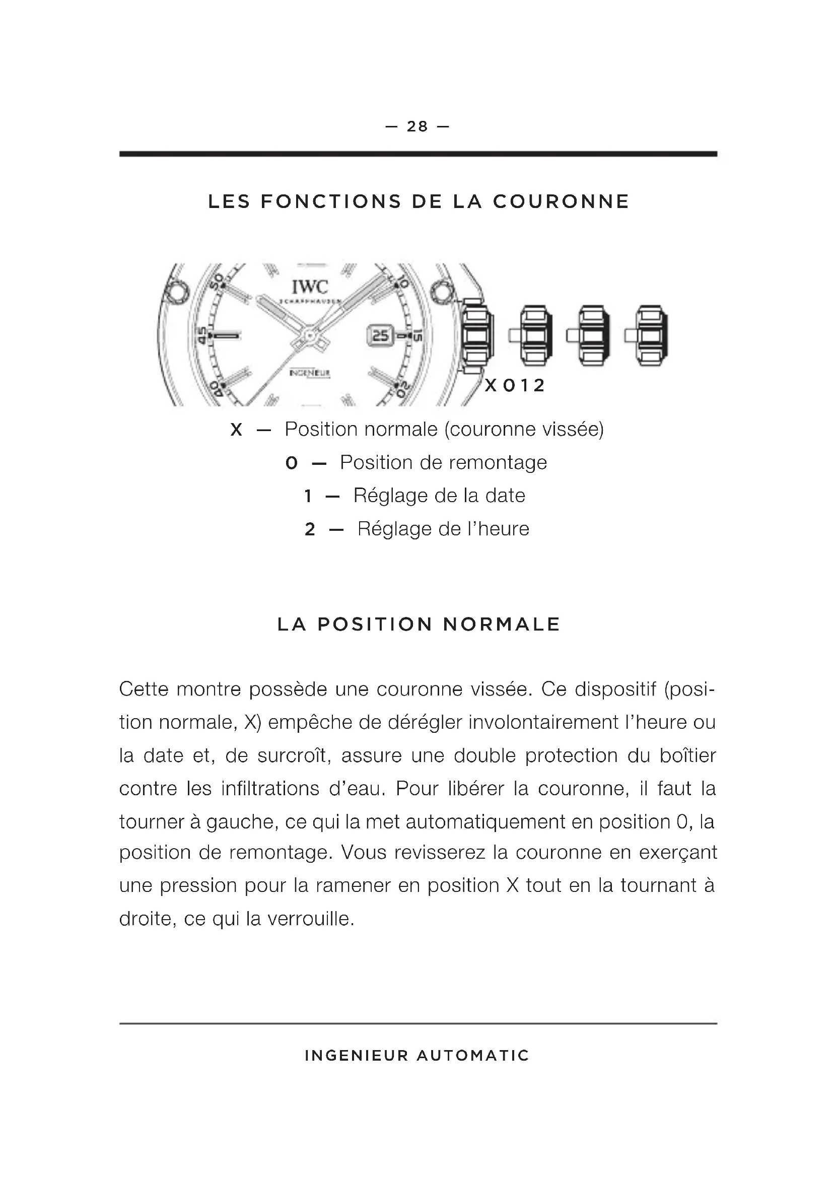 Votre montre IWC vous indique le temps en heures, minutes et secondes ainsi que la date. La montre est étanche 12 bar et protégée par un verre saphir d'un degré 9 selon l'échelle de durété de Mohs. Le mouvement mécanique à remontage automatique a une réserve de marche d'environ 44 heures après remontage complet. La masse oscillante remonte la montre dans les deux sens de rotation grâce au remontage automatique Pellaton. Afin que cette montre exceptionnelle replissse à la perfection ses futurs offices, nous vous recommandons de respecter scrupuleusement les quelques instructions importantes de ce mode d'emploi.