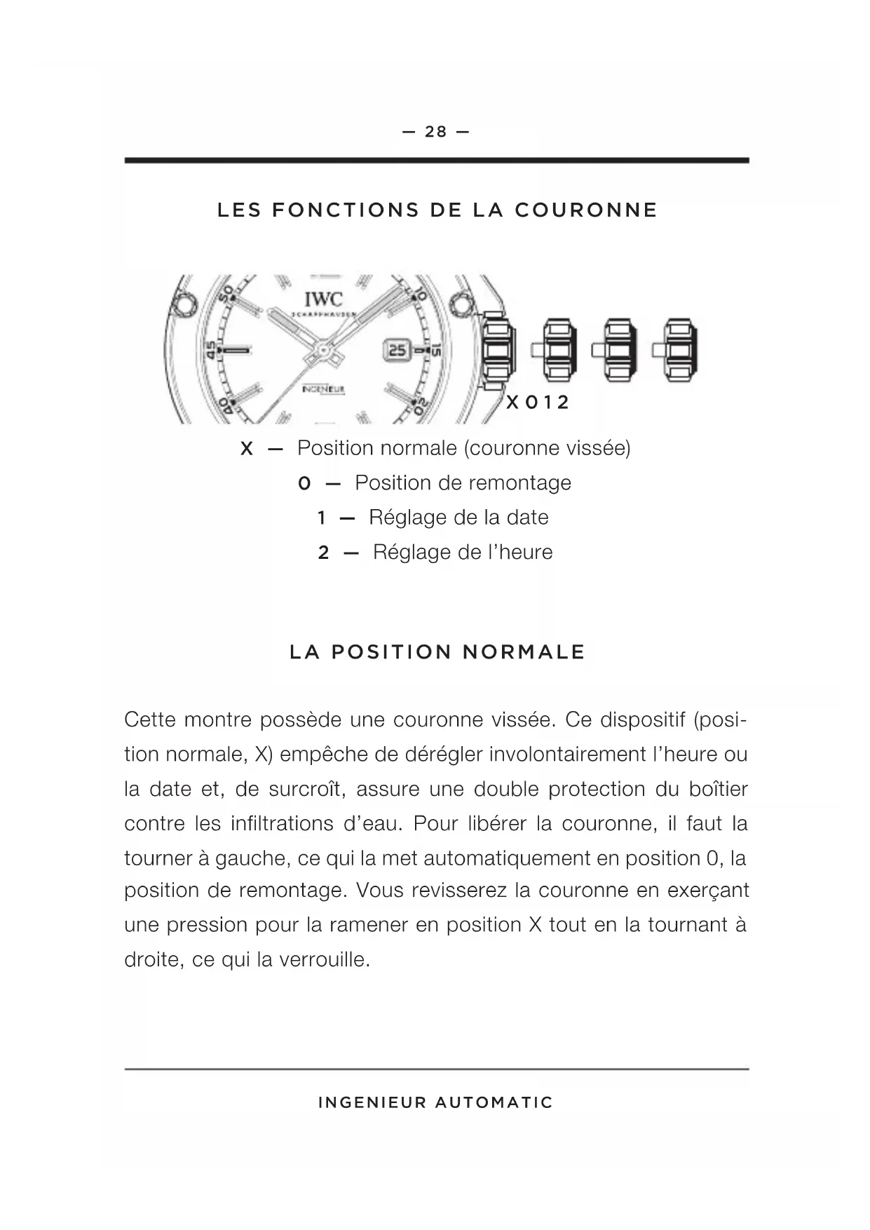1— 28 — ingenieur autOMatic les FOnctiOns de la cOurOnne X — Position normale (couronne vissée) 0 — Position de remontage 1 — Réglage de la date 2 — Réglage de l’heure la pOsitiOn nOrMale Cette montre possède une couronne vissée. Ce dispositif (posi- tion normale, X) empêche de dérégler involontairement l’heure ou la date et, de surcroît, assure une double protection du boîtier contre les infiltrations d’eau. Pour libérer la couronne, il faut la tourner à gauche, ce qui la met automatiquement en position 0, la position de remontage. Vous revisserez la couronne en exerçant une pression pour la ramener en position X tout en la tournant à droite, ce qui la verrouille. X 0 1 2— 29 — ingenieur autOMatic la pOsitiOn de reMOntage Dans la position de remontage (0), vous pouvez aussi remonter manuellement le mouvement automatique. Quelques tours de la couronne suffisent à actionner le mouvement. Toutefois, nous recommandons de remonter la montre en faisant tourner environ 20 fois la couronne afin de garantir une précision maximale. le réglage de la date Si le mois compte moins de 31 jours, vous devez avancer manuel- lement la date au premier jour du mois suivant. Pour ce faire, libé- rez la couronne vissée et tirez-la en position 1. En la tournant à droite, vous pouvez maintenant régler la date (correction directe). Ne procédez jamais à cette correction entre 20 heures et 2 heures du matin, car, durant cette période, le mouvement fait avancer la date automatiquement.— 30 — ingenieur autOMatic le réglage de l’heure Tirez la couronne en position 2. Cette opération arrête le mouve- ment. Pour un réglage à la seconde près, il est préférable d’arrê- ter le mouvement lorsque l’aiguille des secondes se trouve sur 60. Vous pouvez maintenant régler l’heure en faisant tourner la cou- ronne et positionner l’aiguille des minutes exactement au-dessus du trait des minutes. Pour faire démarrer l’aiguille des secondes, il faut remettre la couronne en position 0. Lors du réglage de l’heure, veuillez tenir compte du changement de date qui inter- vient à chaque fois à minuit (24 heures). Si ce changement est déjà intervenu à midi (12 heures), vous devez avancer les aiguilles de 12 heures. Important: dans les positions 0, 1 et 2, la montre est certes étanche, mais la couronne doit toujours être revissée (position X) avant toute utilisation normale. la lecture de l’heure dans l’OBscurité Le cadran ainsi que l’aiguille des heures et celle des minutes de votre montre sont munis d’éléments luminescents vous permet- tant de lire parfaitement l’heure, même dans l’obscurité la plus totale.— 31 — ingenieur autOMatic l’étanchéité Pour les montres IWC, l’indication de l’étanchéité est faite en bar et non en mètres. Fréquemment utilisées dans l’industrie horlogère pour indiquer l’étanchéité, les indications métriques ne coïncident pas avec la profondeur de plongée en raison des processus de tests souvent mis en œuvre. C’est pourquoi les indi- cations métriques ne permettent pas, non plus, une extrapolation quant aux possibilités d’utilisation réelles en cas d’humidité, ainsi que dans ou sous l’eau. Vous trouverez sur Internet les recom- mandations d’utilisation relatives à l’étanchéité de votre montre sur www.iwc.com/water-resistance. Votre concessionnaire IWC agréé (Official Agent) se fera également un plaisir de vous informer. Pour garantir un fonctionnement parfait de votre montre, celle-ci doit être contrôlée au minimum une fois par an par un point service IWC. Un tel contrôle doit aussi être réalisé après toute sollicitation exceptionnelle. Si ces contrôles ne sont pas réalisés correctement ou si la montre est ouverte par des personnes non autorisées, IWC rejette alors toute revendication au titre de la garantie ou de la responsabilité. Recommandation: après chaque ouverture et service de votre montre IWC, votre concessionnaire IWC agréé (Official Agent) doit de nouveau procéder à un contrôle de l’étanchéité.— 32 — ingenieur autOMatic reMarque Si votre montre est dotée d’un bracelet en cuir, textile ou caout- chouc avec des incrustations en cuir ou en textile, nous vous recom mandons d’éviter tout contact de votre bracelet de grande qualité avec l’eau, les matières grasses, les produits solvants et dé- tergents ou les cosmétiques. De cette manière, vous pouvez pré- venir les modifications de couleur et une altération rapide du cuir. le service de vOtre ingenieur autOMatic Toutes les pièces de cette montre sont fabriquées dans les meil- leures matières. Néanmoins, certaines pièces sont soumises à une usure naturelle. Il est surtout important que ces pièces soient toujours parfaitement huilées et que les dépôts d’huile dus au frottement métallique soient éliminés à temps. Nous vous recom- mandons pour cette raison de prévoir une révision de votre montre tous les cinq ans environ. Pour ce faire, veuillez vous adresser à un concessionnaire IWC agréé (Official Agent) ou directement au service après-vente IWC à Schaffhausen.— 33 — Situation: avril 2013. Sous réserve de modifications techniques. les MatériauX des BOîtiers Matériau du BOîtier résistance auX rayur e s résistance à la rupture pOids acier Fin faible