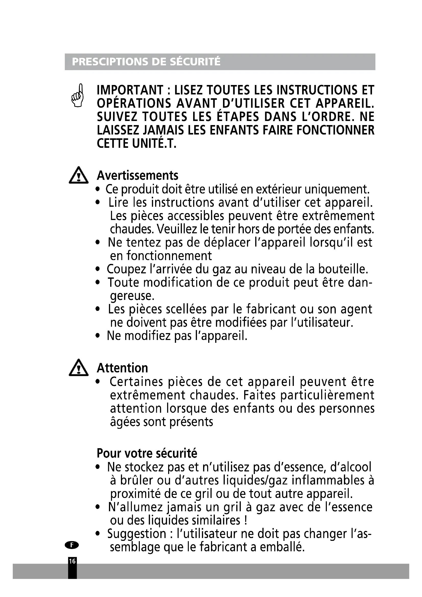 - N’allumez jamais un gril à gaz avec de l’essence ou des liquides similaires !