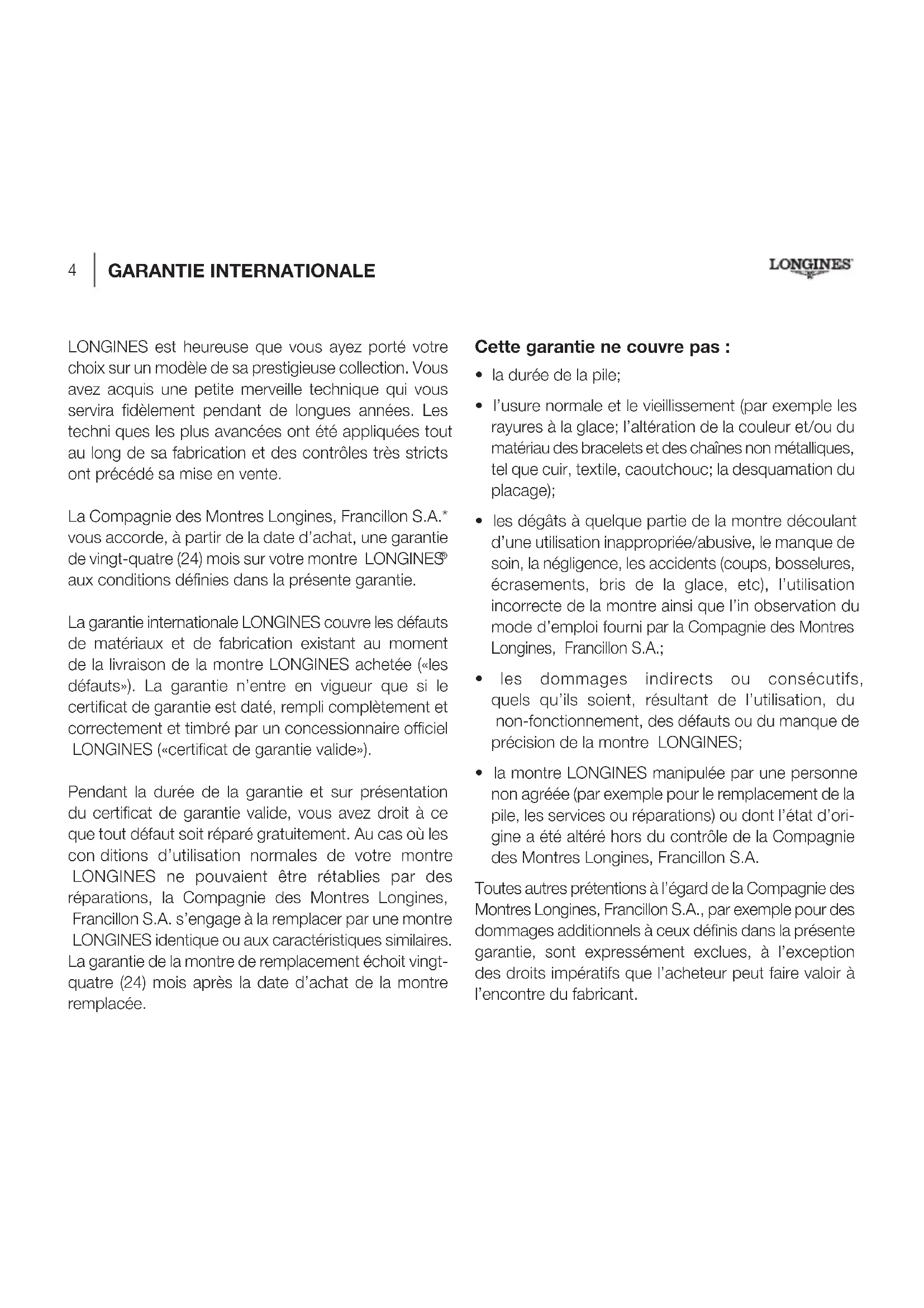 Pendant la durée de la garantie et sur présentation du certificat de garantie valide, vous avez droit à ce que tout défaut soit réparé gratuitement. Au cas où les conditions d'utilisation normales de votre montre LONGINES ne pouvaient être rétablies par des réparations, la Compagnie des Montres Longines, Francillon S.A. s'engage à la remplacer par une montre LONGINES identique ou aux caractéristiques similaires. La garantie de la montre de remplacement échoit vingt-quatre (24) mois après la date d'achat de la montre remplacée.