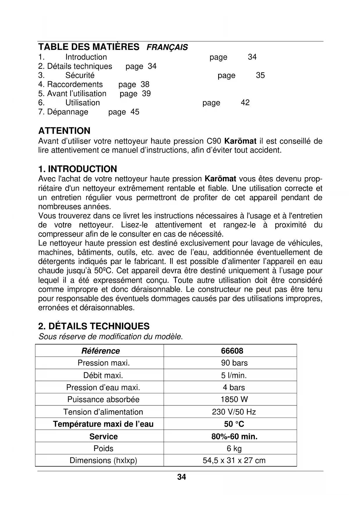 ATTENTION Avant d’utiliser votre nettoyeur haute pression C90 Karömat il est conseillé de lire attentivement ce manuel d’instructions, afin d’éviter tout accident.