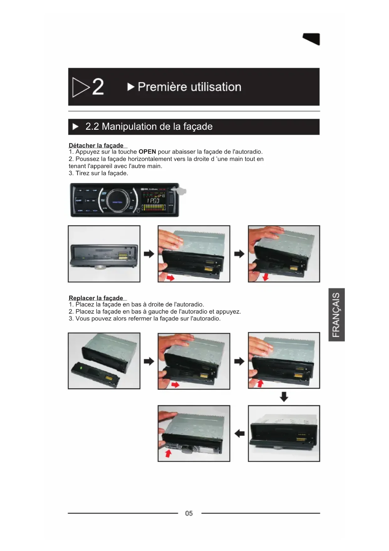 1. Appuyez sur la touche OPEN pour abaisser la façade de l'autoradio.