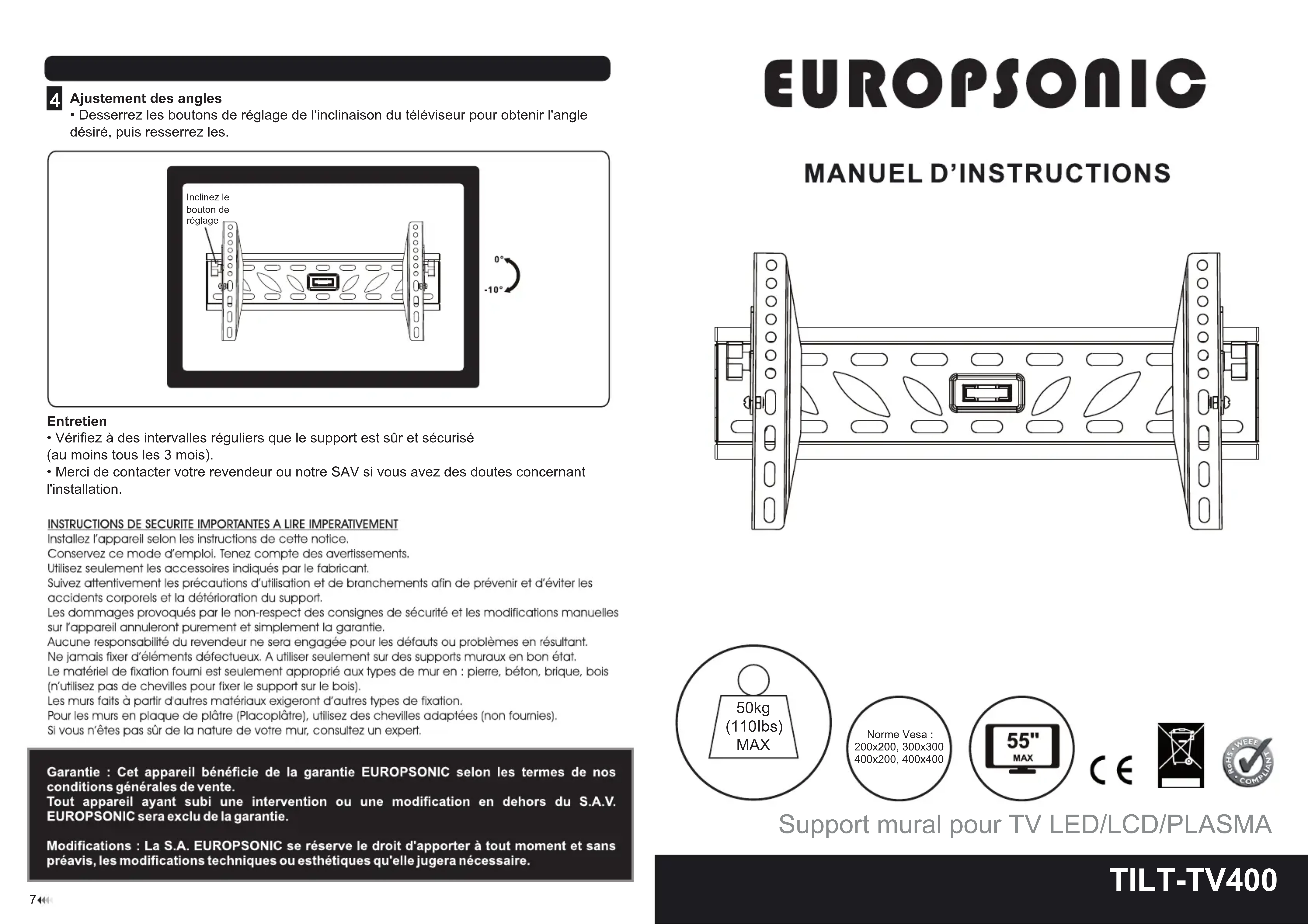 TILTTV400 - Support mural Europsonic - Notice d'utilisation et mode d'emploi gratuit