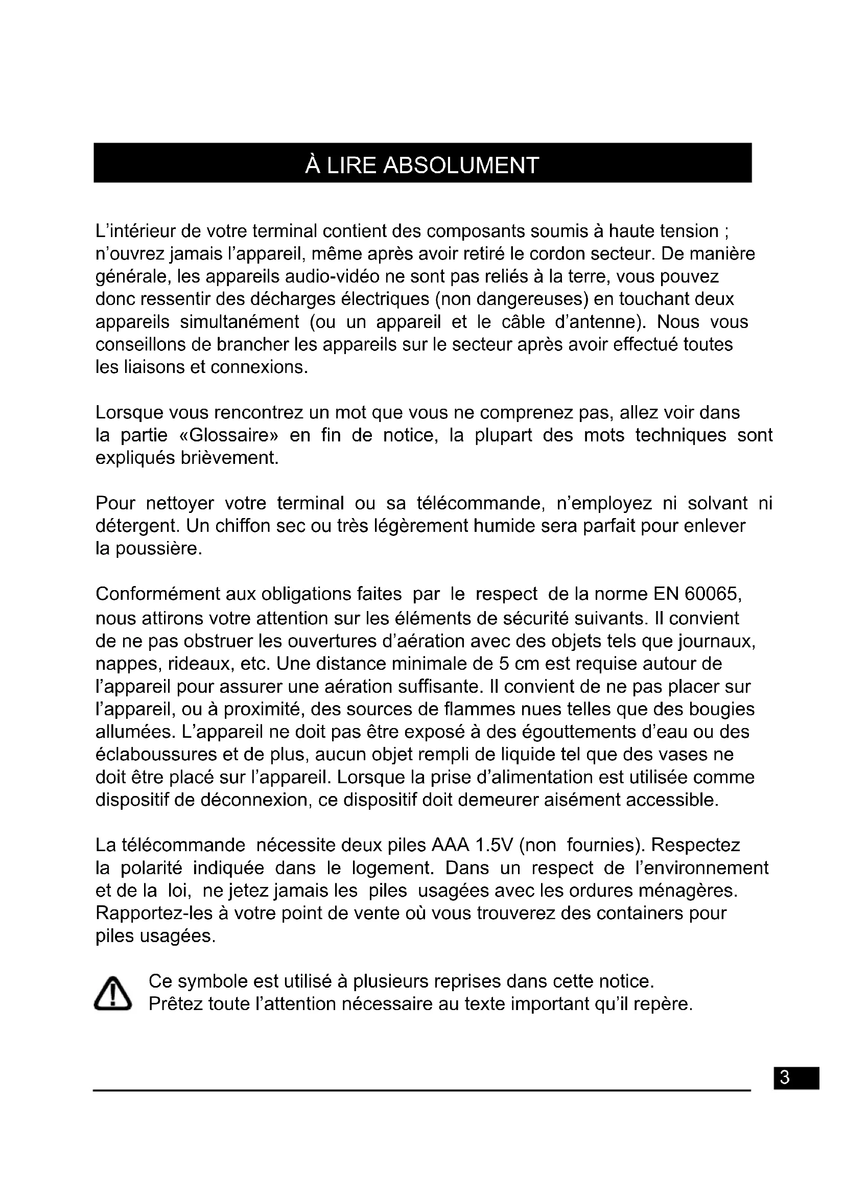 Ce symbole est utilisé à plusieurs reprises dans cette notice. Prêtez toute l'attention nécessaire au texte important qu'il repère.