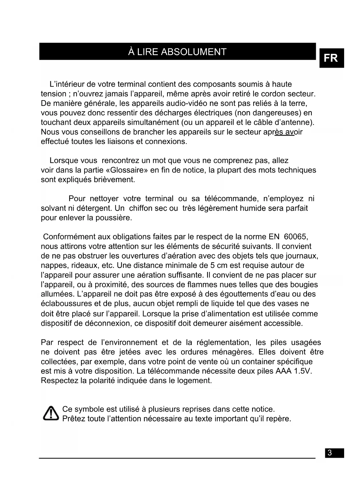L'intérieur de votre terminal contient des composants soumis à haute tension ; n'ouvre jamais l'appareil, même après avoir retire le cordon secteur. De manière générale, les-appareils audio-video ne sont pas reliés à la terre, vous pouvez donc dessentir des décharges électriques (non dangereuses) en touchant deux-appareils simultanément (ou un apparéil et le cable d'antenne). Nous vous conseillons de brancher les-appareils sur le secteur après avoir effectué toutes les liaisons et connexions.