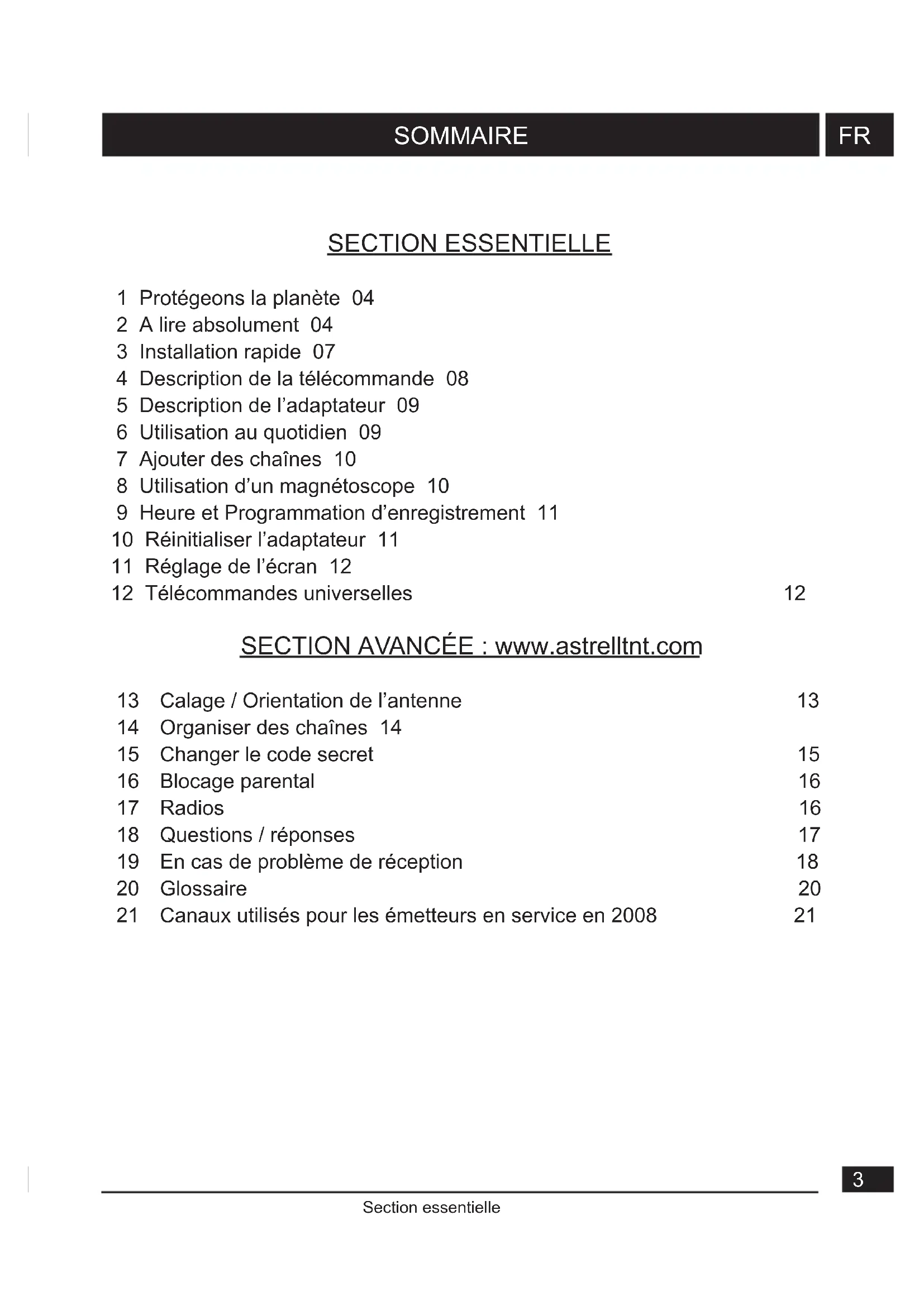 La deuxième partie, appelée « section avancée», comporte des informations qui sont utile dans des cas rares. On y trouve par exemple des astuces pour régler l'antenne en cas de mauvaise réception. Nous y avons également placé la description de menus importants, mais très intuitifs.