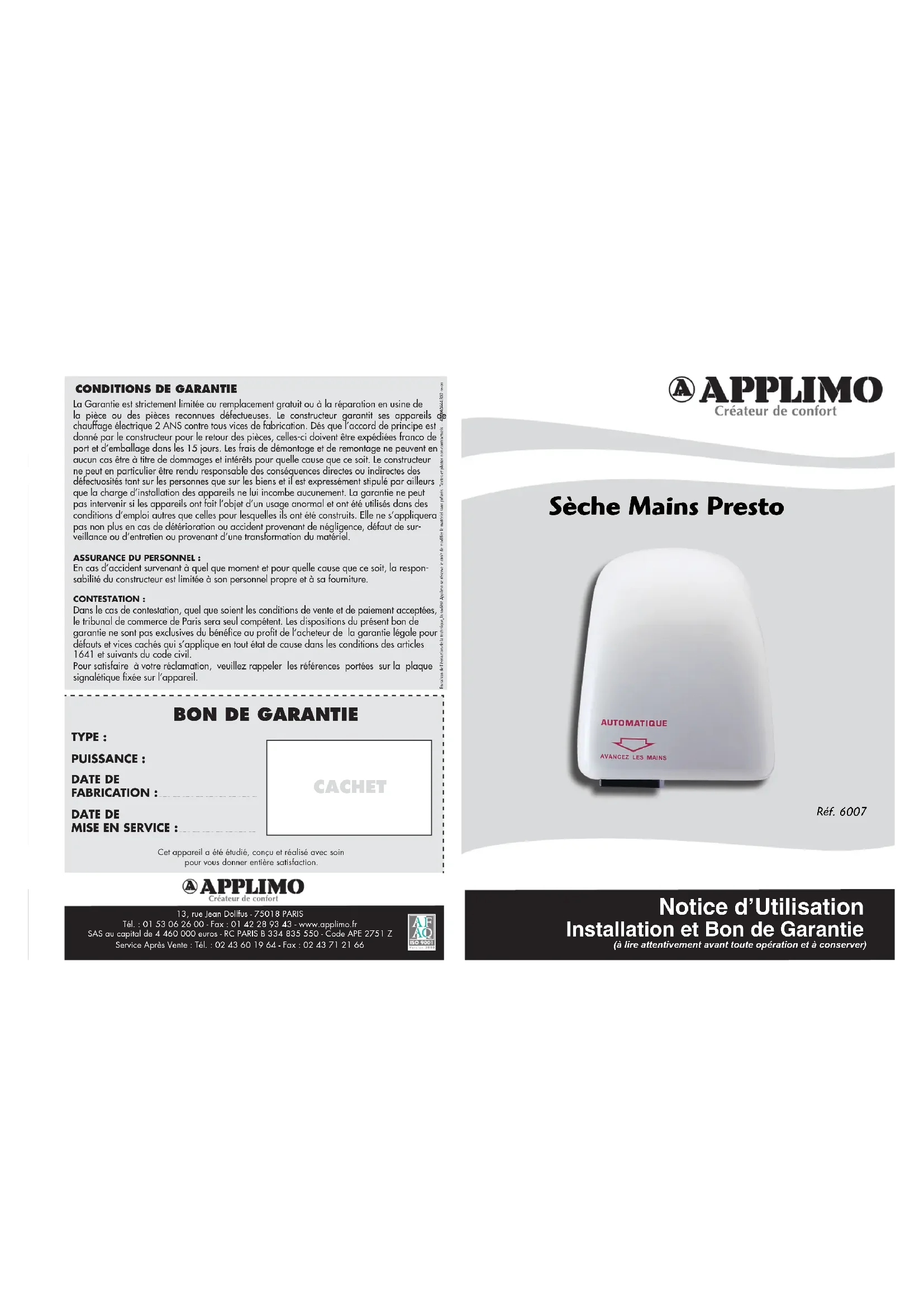Sèche Mains Presto (à lire attentivement avant toute opération et à conserver) Installation et Bon de Garantie Notice d’Utilisation TYPE :............................................................................................................................................................................................................................................ PUISSANCE :............................................................................................................................................................................... DATE DE FABRICATION : ........................................................................................................................................................... DATE DE MISE EN SERVICE : ............................................................................................................................ Cet appareil a été étudié, conçu et réalisé avec soinpour vous donner entière satisfaction. Bon de Garantie La Garantie est strictement limitée au remplacement gratuit ou à la réparation en usine de la pièce ou des pièces reconnues défectueuses. Le constructeur garantit ses appareils de chauffage électrique 2 ANS contre tous vices de fabrication. Dés que l’accord de principe est donné par le constructeur pour le retour des pièces, celles-ci doivent être expédiées franco de port et d’emballage dans les 15 jours. Les frais de démontage et de remontage ne peuvent en aucun cas être à titre de dommages et intérêts pour quelle cause que ce soit. Le constructeur ne peut en particulier être rendu responsable des conséquences directes ou indirectes des défectuosités tant sur les personnes que sur les biens et il est expressément stipulé par ailleurs que la charge d’installation des appareils ne lui incombe aucunement. La garantie ne peut pas intervenir si les appareils ont fait l’objet d’un usage anormal et ont été utilisés dans des conditions d’emploi autres que celles pour lesquelles ils ont été construits. Elle ne s’appliquera pas non plus en cas de détérioration ou accident provenant de négligence, défaut de sur-veillance ou d’entretien ou provenant d’une transformation du matériel.ASSURANCE DU PERSONNEL :En cas d’accident survenant à quel que moment et pour quelle cause que ce soit, la respon-sabilité du constructeur est limitée à son personnel propre et à sa fourniture.CONTESTATION :Dans le cas de contestation, quel que soient les conditions de vente et de paiement acceptées, le tribunal de commerce de Paris sera seul compétent. Les dispositions du présent bon de garantie ne sont pas exclusives du bénéfice au profit de l’acheteur de la garantie légale pour défauts et vices cachés qui s’applique en tout état de cause dans les conditions des articles 1641 et suivants du code civil.Pour satisfaire à votre réclamation, veuillez rappeler les références portées sur la plaque signalétique fixée sur l’appareil.ConditionS de Garantie En raison de l’évolution de la technique, la société Applimo se réserve le droit de modifier le matériel sans préavis - Textes et photos non contractuels - 421AA0444.B02 46/09 13, rue Jean Dollfus - 75018 PARISTél. : 01 53 06 26 00 - Fax : 01 42 28 93 43 - www.applimo.frSAS au capital de 4 460 000 euros - RC PARIS B 334 835 550 - Code APE 2751 ZService Après Vente : Tél. : 02 43 60 19 64 - Fax : 02 43 71 21 66 CaChet Réf. 60072. 5.