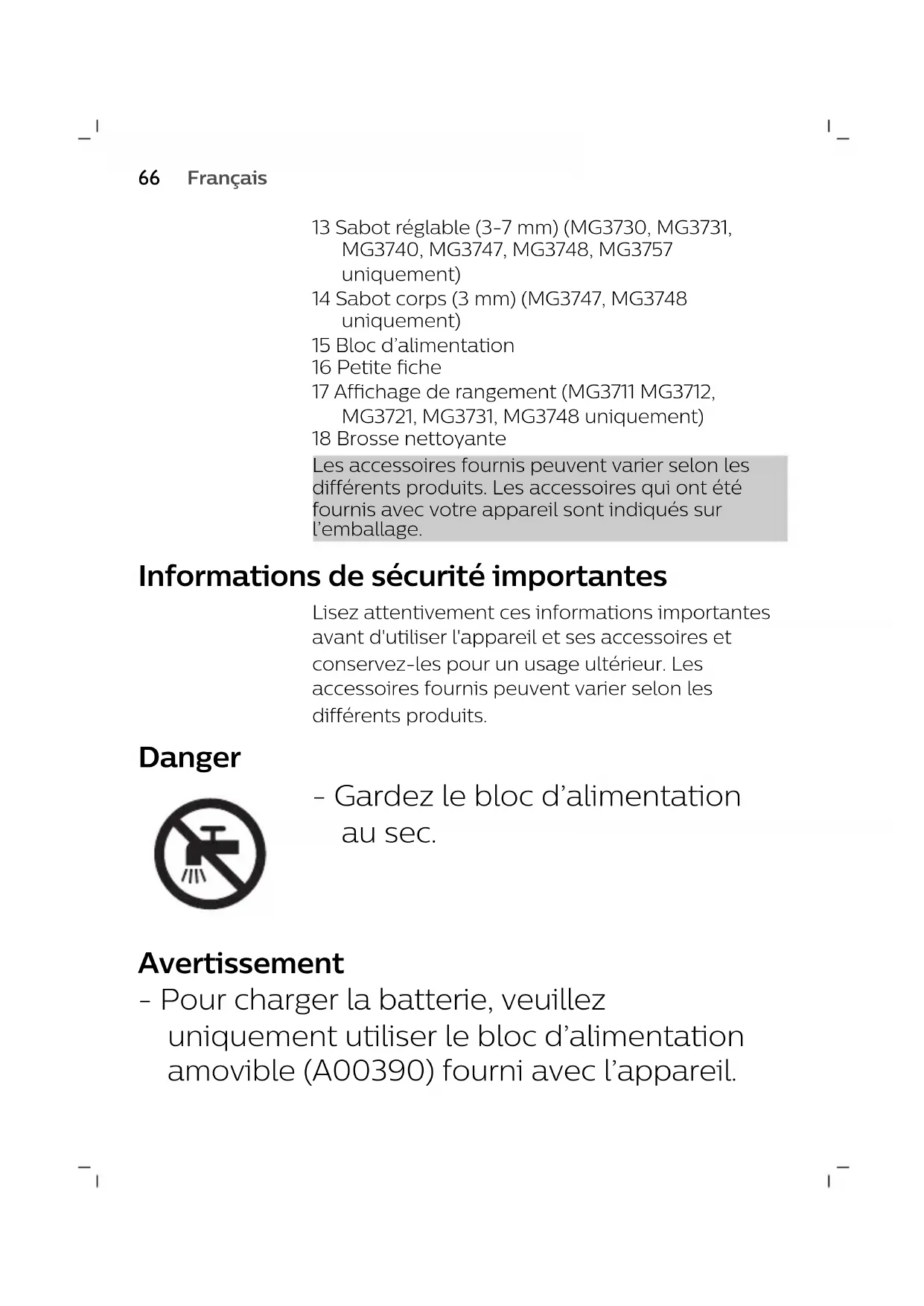Français13 Sabot réglable (3-7mm) (MG3730, MG3731, MG3740, MG3747, MG3748, MG3757 uniquement) 14 Sabot corps (3mm) (MG3747, MG3748 uniquement) 15 Bloc d’alimentation 16 Petite fiche 17 Affichage de rangement (MG3711 MG3712, MG3721, MG3731, MG3748 uniquement) 18 Brosse nettoyante Les accessoires fournis peuvent varier selon les différents produits. Les accessoires qui ont été fournis avec votre appareil sont indiqués sur l’emballage. Informations de sécurité importantes Lisez attentivement ces informations importantes avant d'utiliser l'appareil et ses accessoires et conservez-les pour un usage ultérieur. Les accessoires fournis peuvent varier selon les différents produits. Danger - Gardez le bloc d’alimentation au sec. Avertissement - Pour charger la batterie, veuillez uniquement utiliser le bloc d’alimentation amovible (A00390) fourni avec l’appareil.