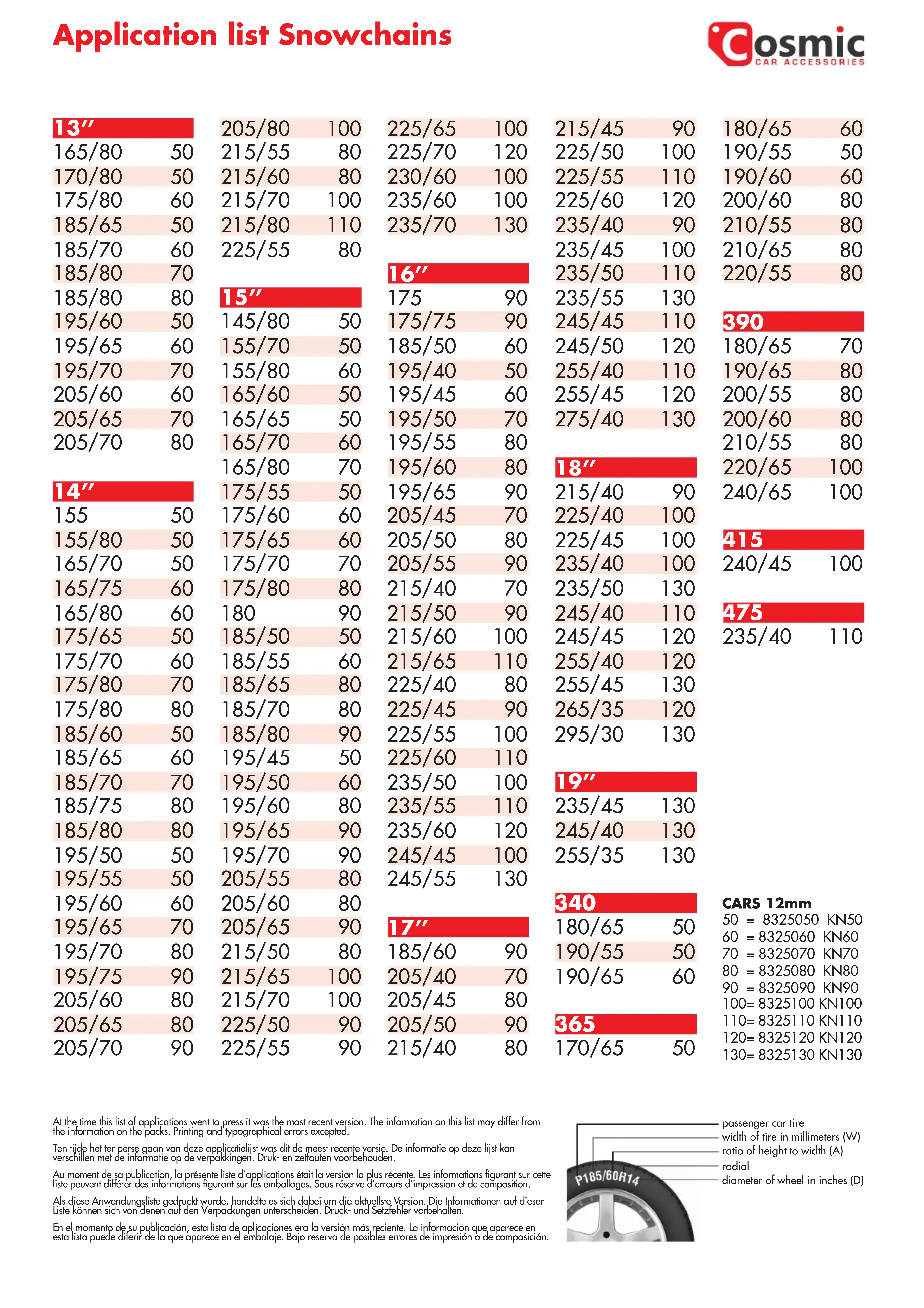 | Caractéristiques techniques | Chaîne à neige Cosmic KNI90, adaptée pour les pneus de taille 195/70 R15 |