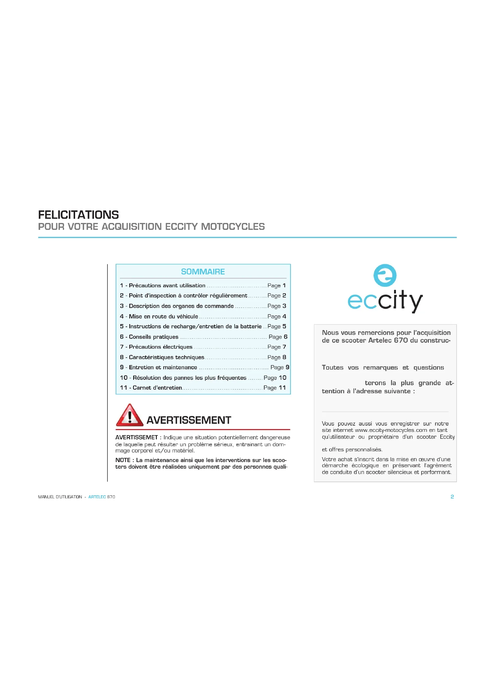 Téléchargez la notice de votre Scooter au format PDF gratuitement ! Retrouvez votre notice Artelec 670 - Eccity et reprennez votre appareil électronique en main. Sur cette page sont publiés tous les documents nécessaires à l'utilisation de votre appareil Artelec 670 de la marque Eccity.