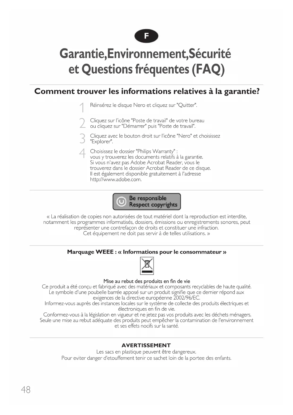Garantie, Environnement, Sécurité et Questions fréquentes (FAQ) 48