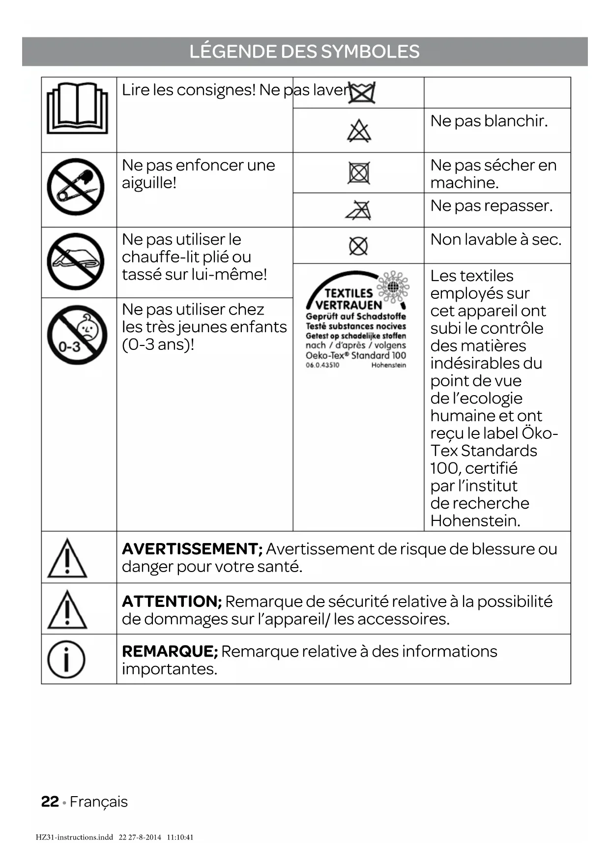 ![]() | Ne pas utiliser le chauffe-lit plié ou tassé sur lui-même! | ![]() |