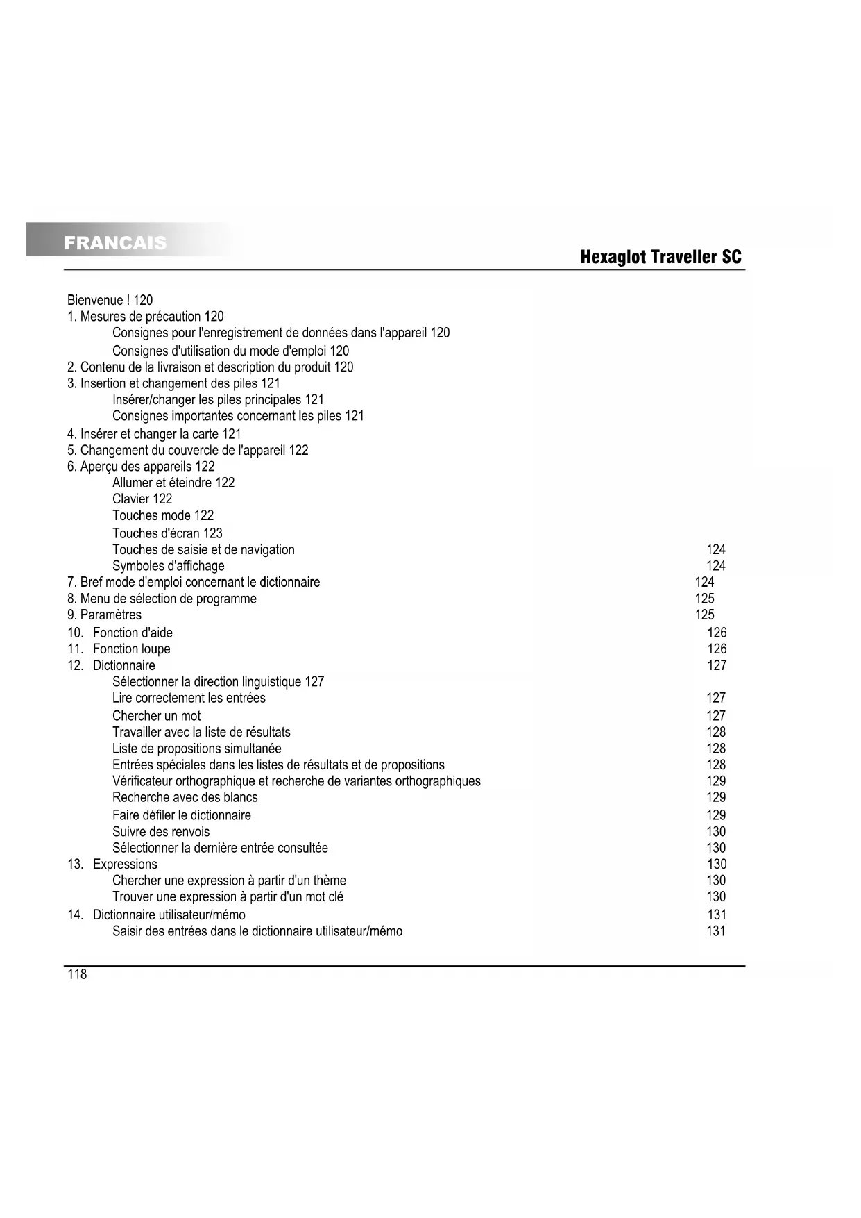 FRANCAIS Bienvenue! Merci d'avoir choisi l'Hexaglot Traveller SC. Veuillez prendre quelques minutes pour lire attentivement et entièrement ce mode d'emploi avant la première utilisation afin de pouvoir utiliser l'ensemble des fonctions de cet appareil et avoir le plaisir de vous en servir pendant de nombreuses années. Veuillez conserver soignouveausement ce mode d'emploi pour consultation ultérieure. Hexaglot vous souhaite un bon travail avec l'Hexaglot Traveller SC!