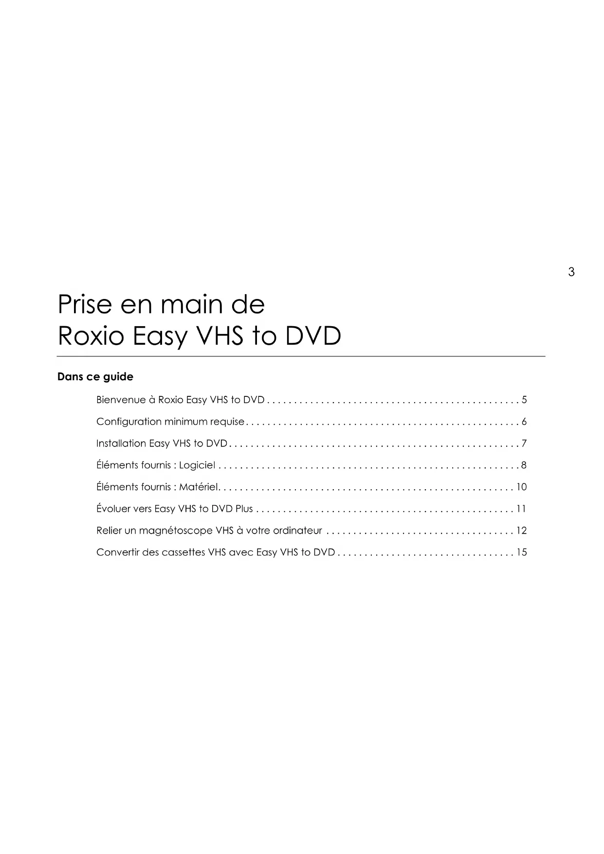 - Easy VHS to DVD 3 Plus Guide de démarrageRoxio Easy VHS to DVD : Guide de démarrage www.roxio.com ii3 Prise en main de Roxio Easy VHS to DVD Dans ce guide Bienvenue à Roxio Easy VHS to DVD p. 5